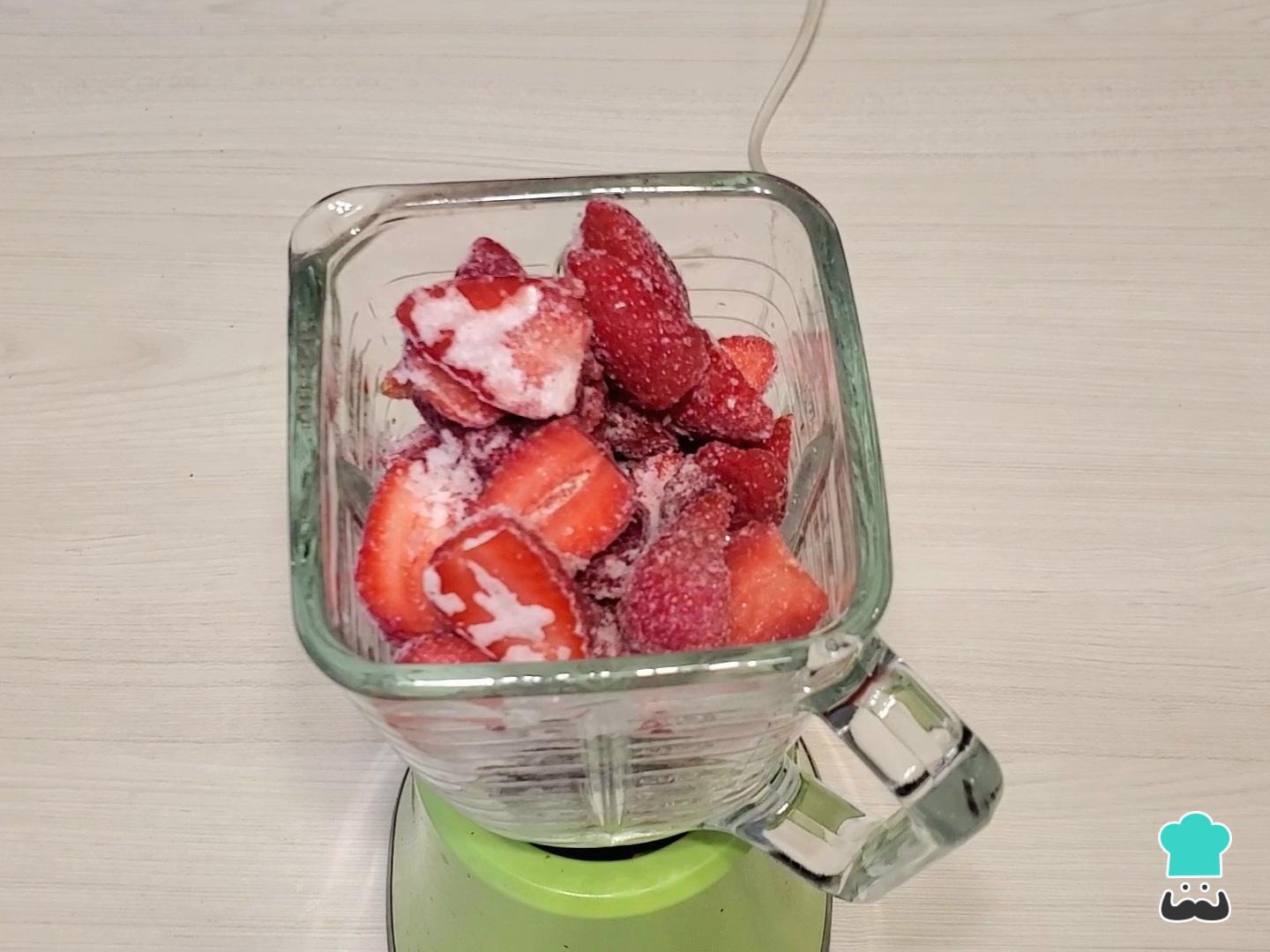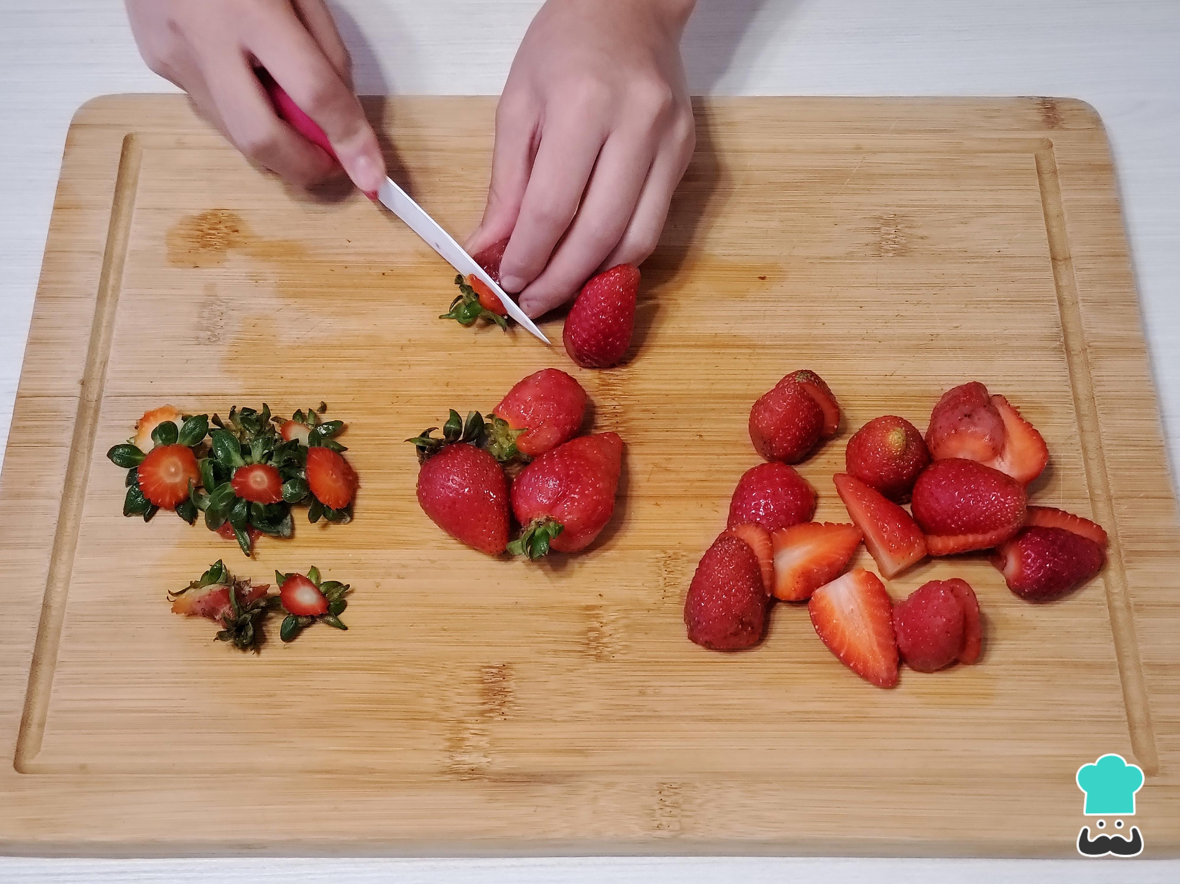 Empieza limpiando las fresas, es decir, lávalas bien y procede a retirarles la parte de las hojas y tallos. Luego, córtalas por la mitad o en cuartos para facilitar el trabajo al procesador o la licuadora.