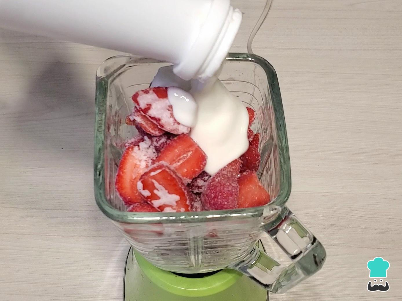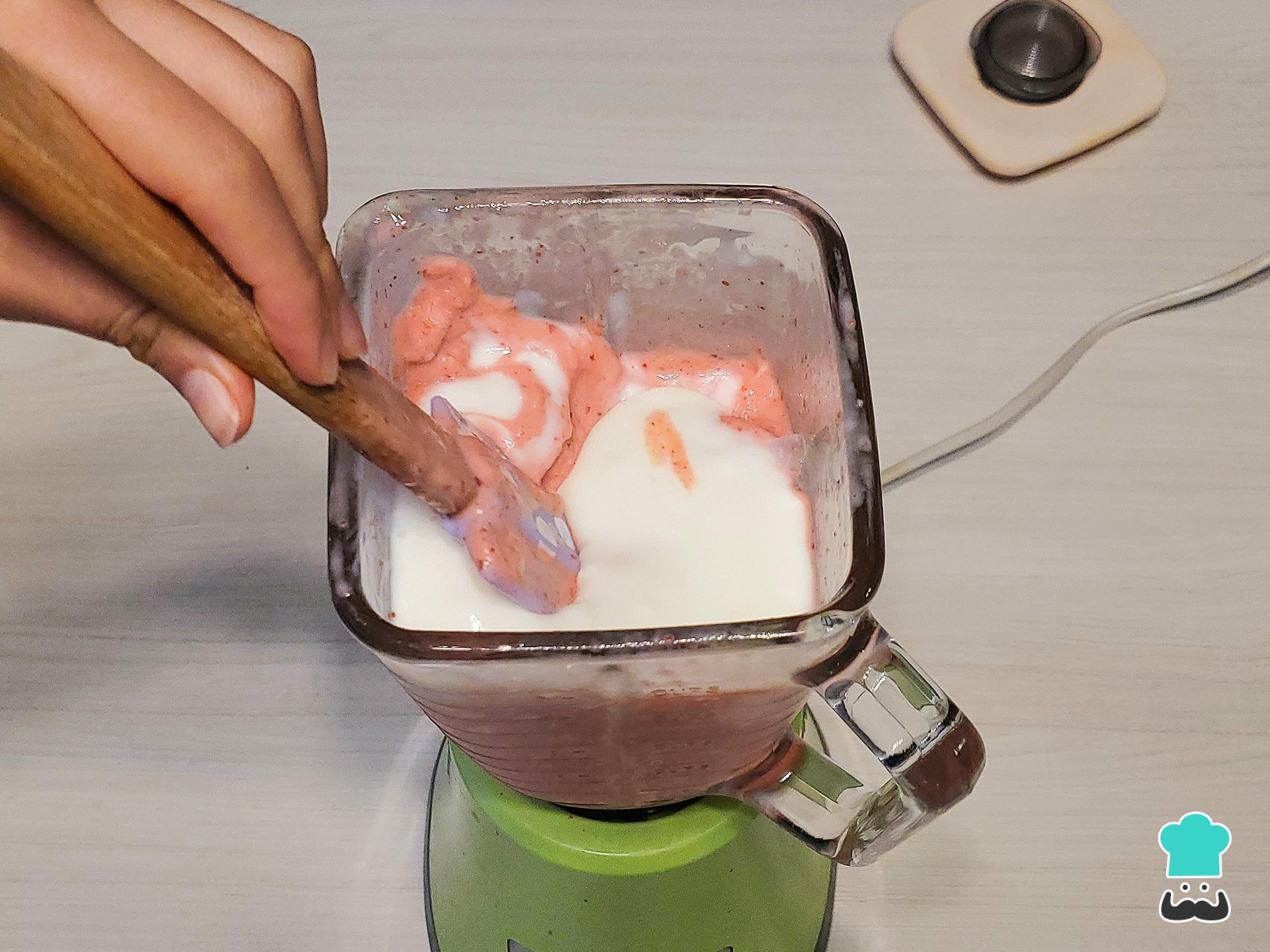 Al día siguiente, coloca estas fresas en un procesador de alimentos (que permite comer el helado después de triturar) o, si no lo tienes, colócalas dentro del vaso e la licuadora. Si usas la licuadora, ten en cuenta que necesitarás agregar más yogur para lograr una mezcla homogénea; por tanto, tendrás que congelar la mezcla por un par de horas más.