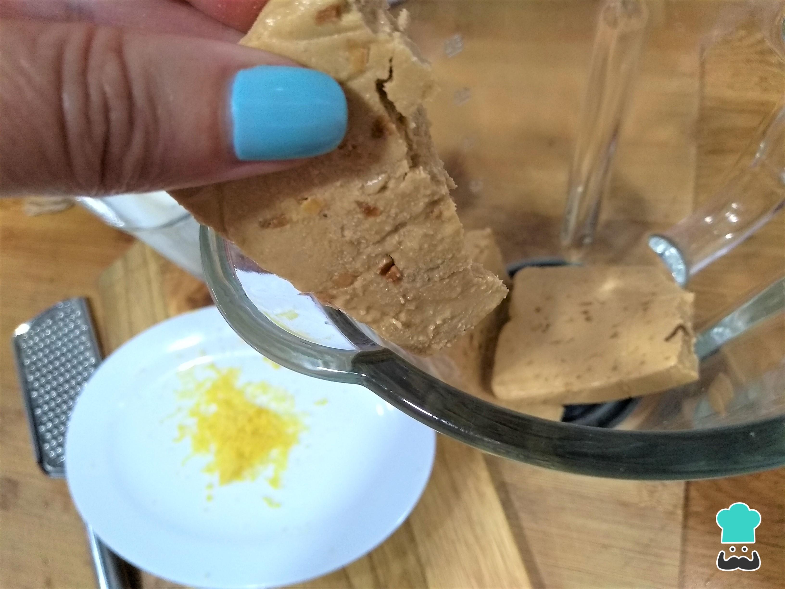 Agrega la ralladura y bate a velocidad media, sin prisa, durante 3 minutos. Si te gusta encontrar trocitos de almendra podrás picar almendra tostada y añadirla al final cuando ya haya pasado el tiempo de batidos o espolvorearla sobre el helado antes de servirlo.
