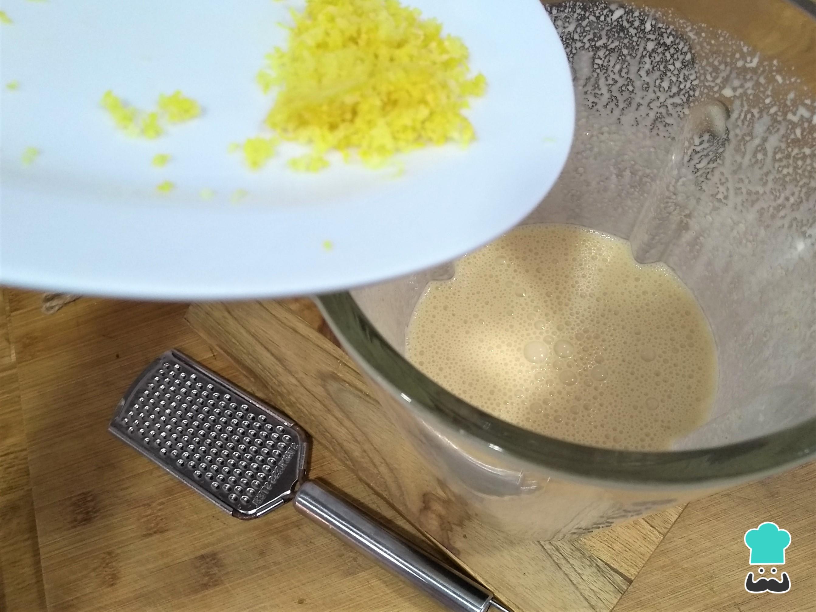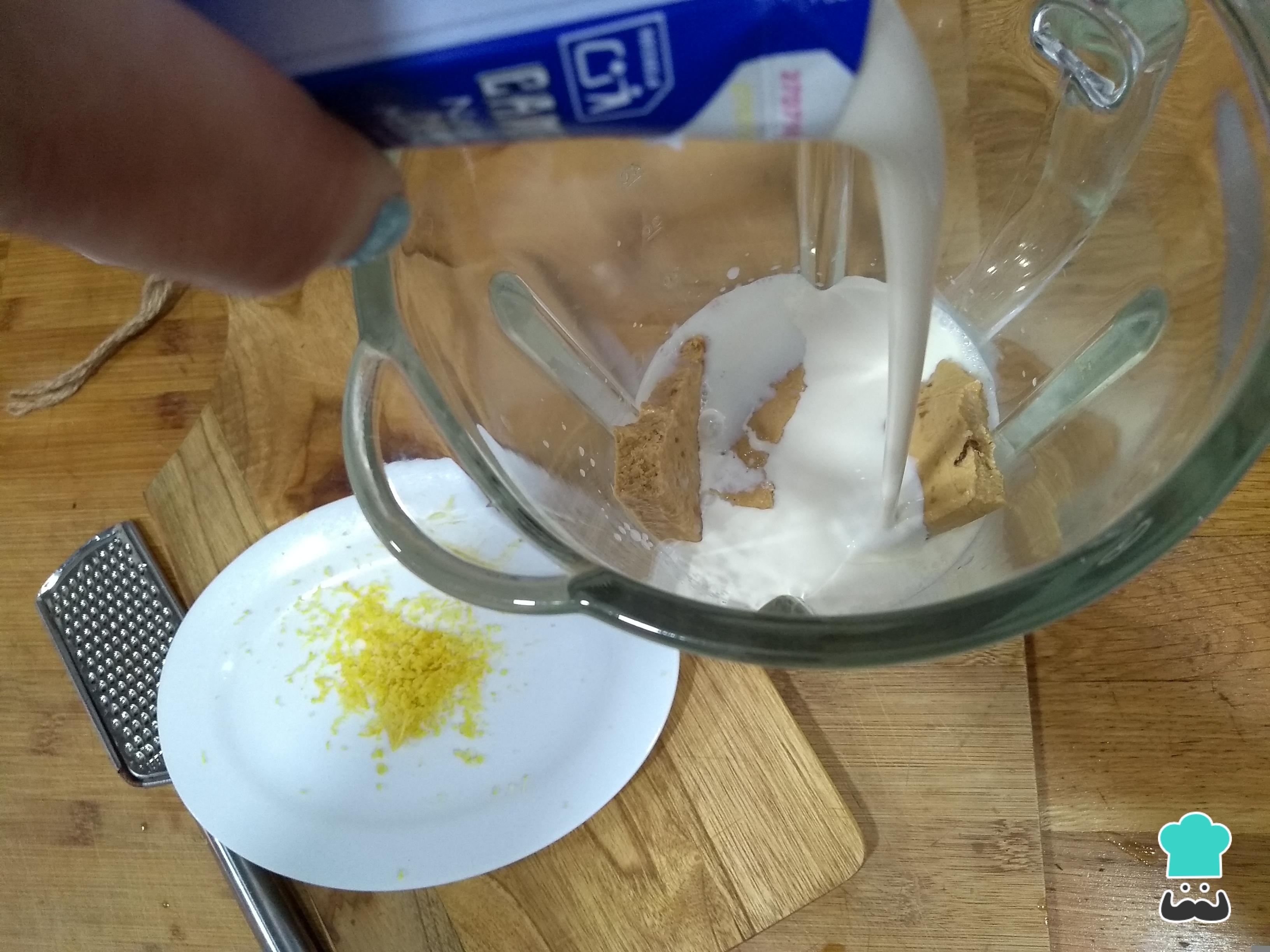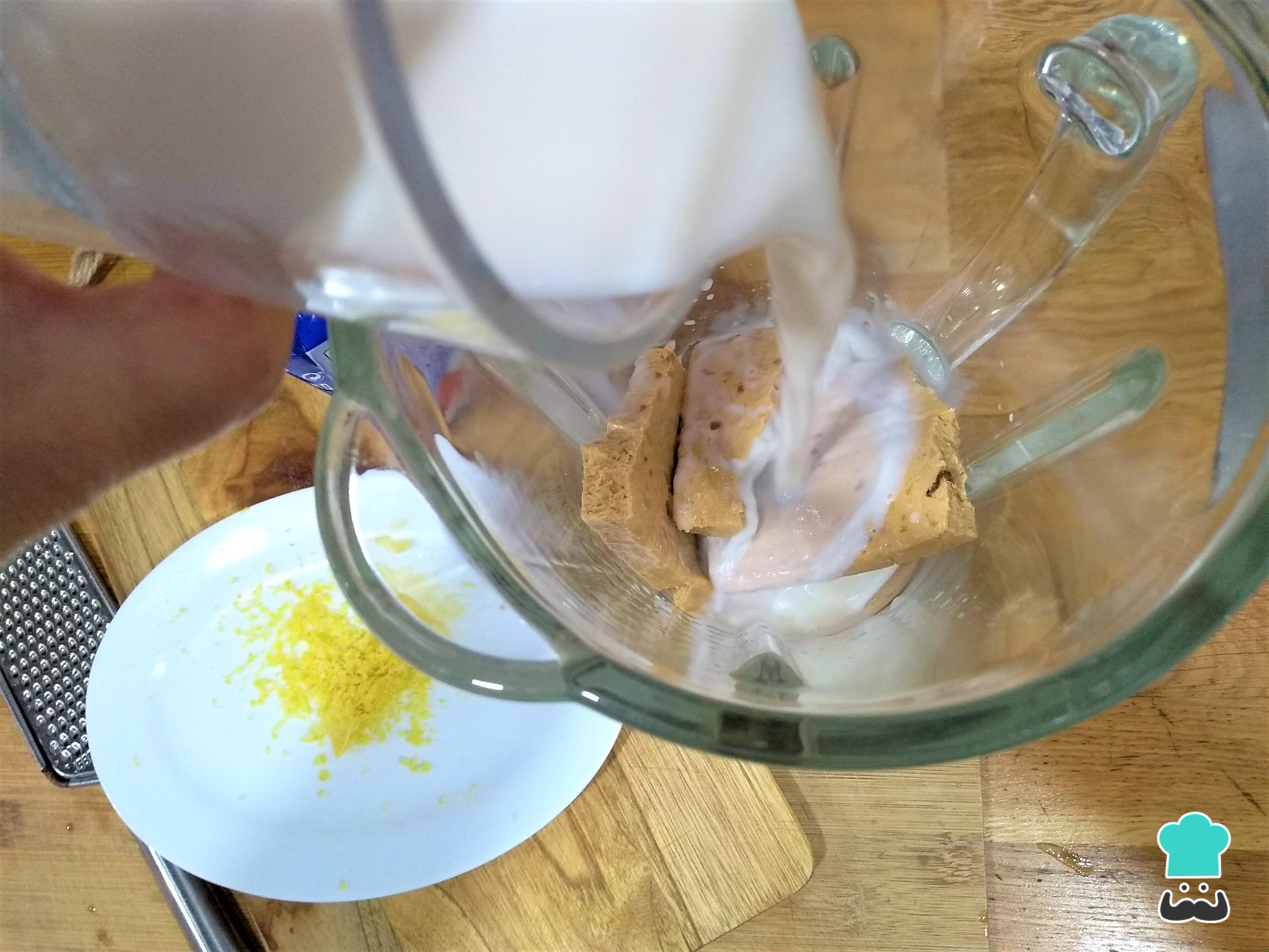 Añade la leche y prepara la ralladura de limón. Puedes hacer este helado de turrón de Jijona con leche de vaca o vegetal.