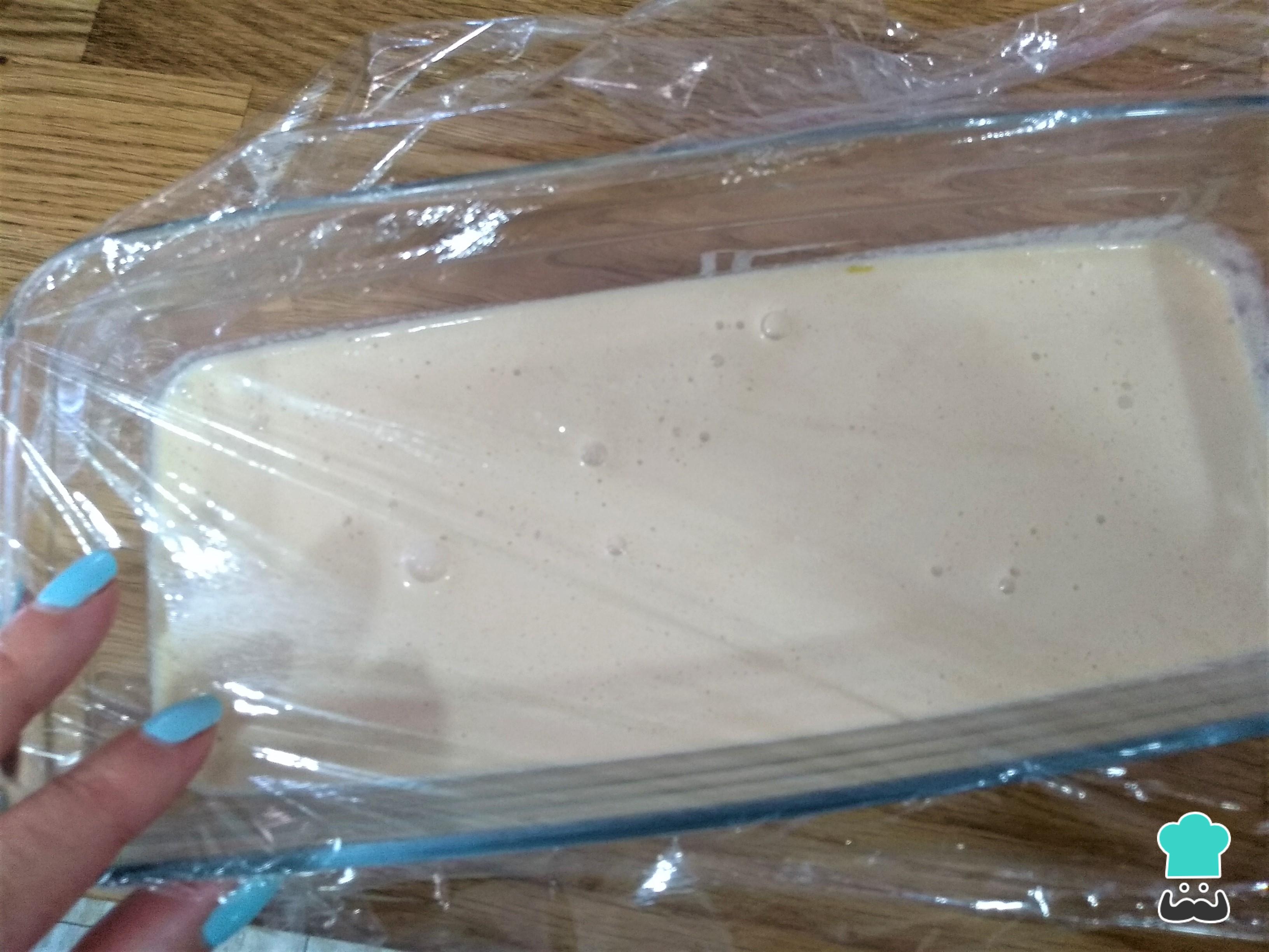 Introduce la mezcla en un recipiente adecuado para congelar. Cubre el helado de turrón de Jijona con papel film para que quede envasado y no se pueda colar aire dentro y congélalo durante 24 horas aproximadamente. No tendrás que remover el helado en ningún momento, simplemente congelar y servir.