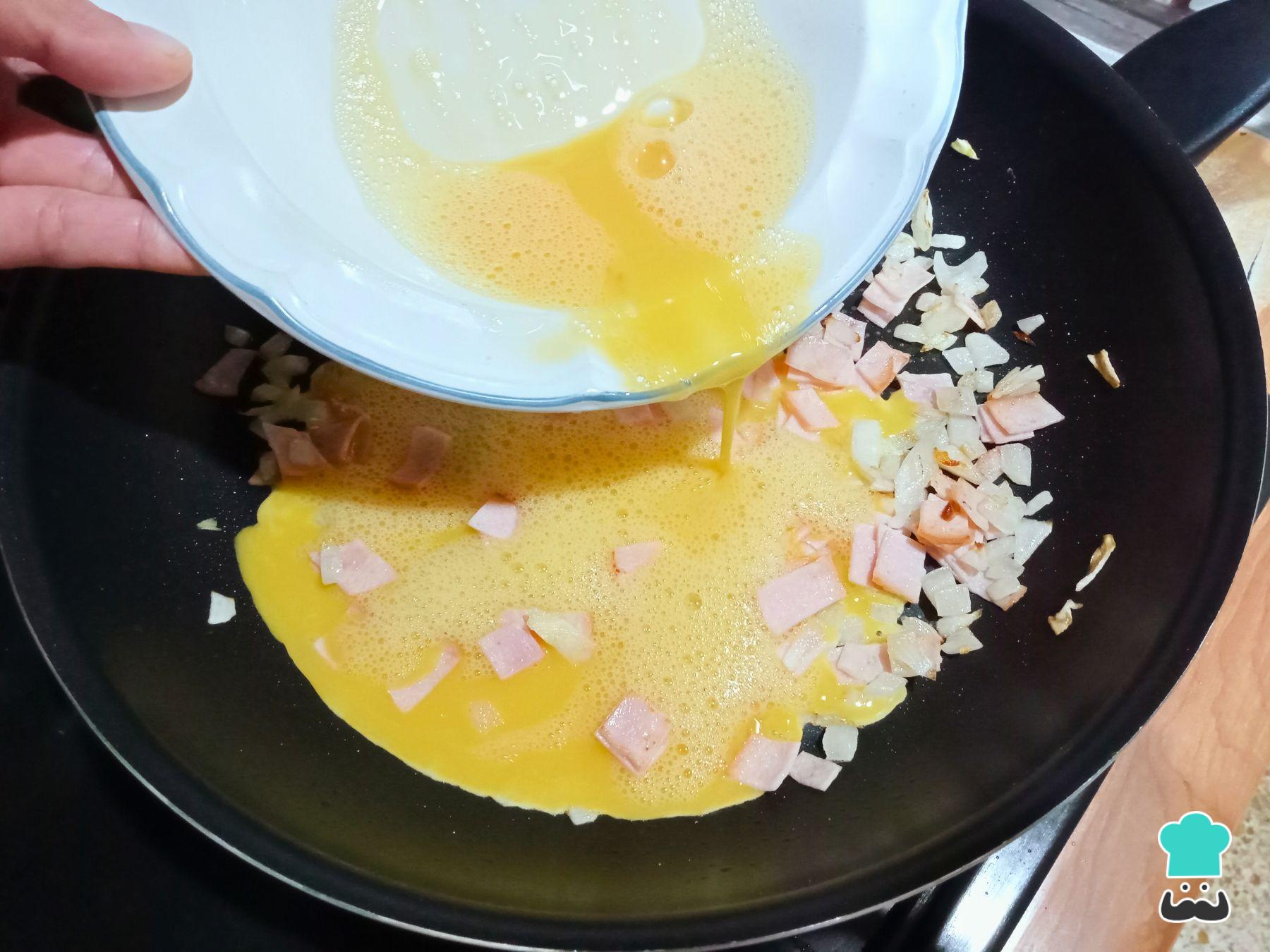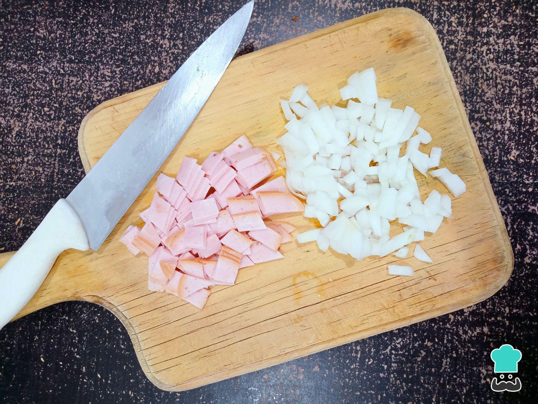 Pica el jamón y la cebolla en cubos medianos. Puede ser jamón de pavo o de cerdo, cocido o ahumado.