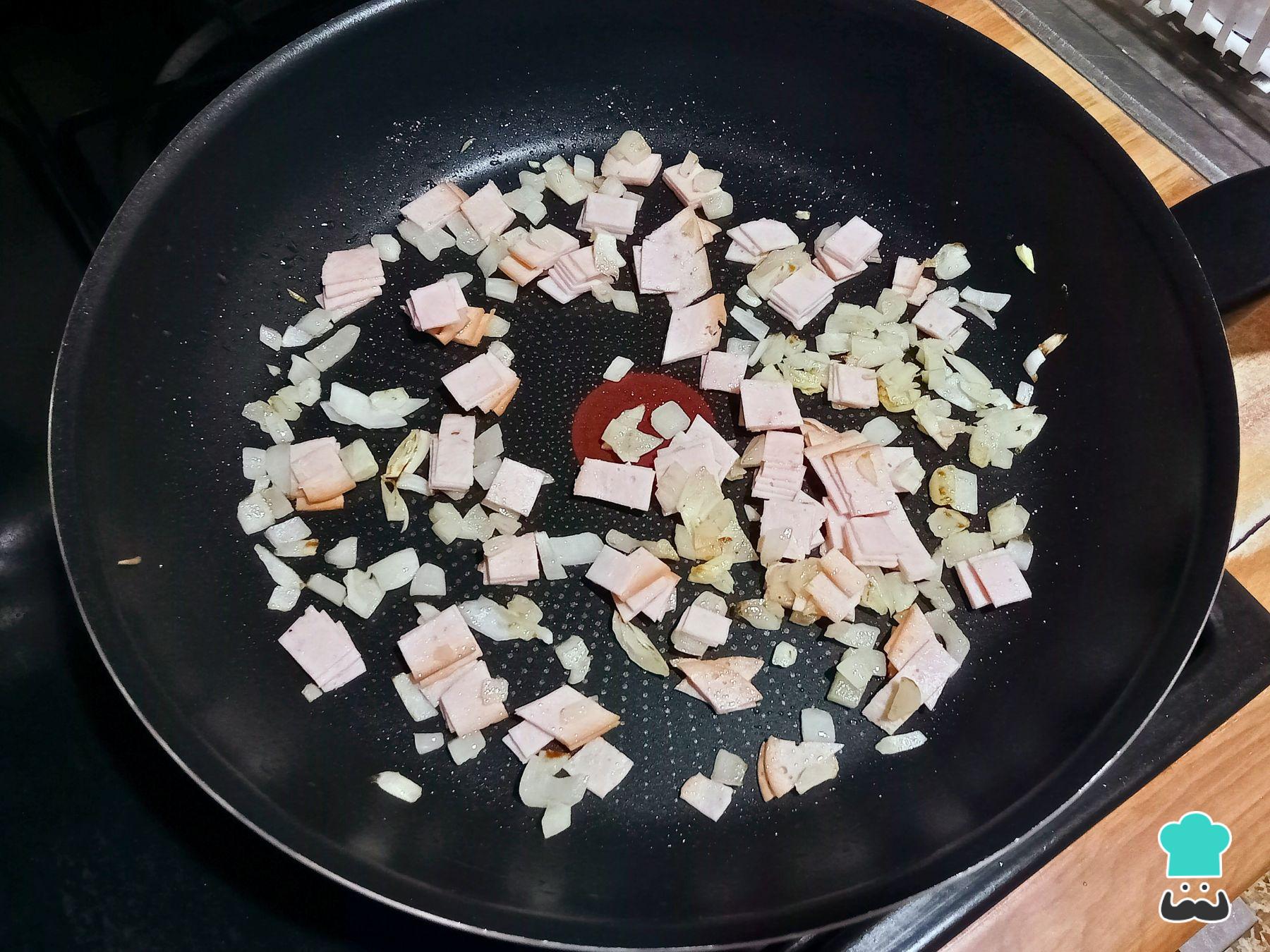 Agrega los trozos de jamón junto con la cebolla y cocínalos hasta que estén dorados y crujientes. Esto ayudará a resaltar el sabor del jamón.