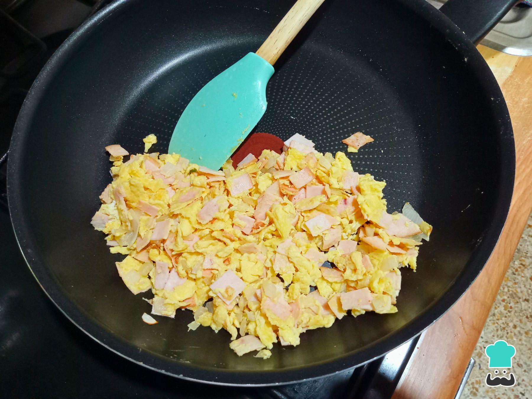Vierte los huevos batidos sobre la mezcla de jamón y frijoles y remueve suavemente con una espátula para mezclar los ingredientes.