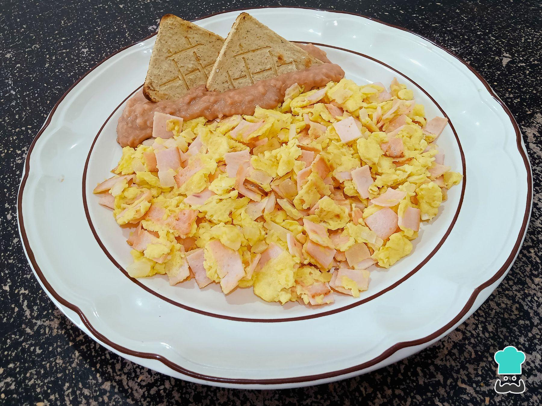 Retira la sartén del fuego y sirve los huevos revueltos con jamón y frijoles mientras están calientes. Esperamos que disfrutes de este útil y práctico almuerzo y, si tienes alguna duda sobre el procedimiento o los ingredientes, puedes escribirla en la sección de comentarios y con gusto te responderemos. ¡Recuerda compartir con nosotros una fotografía del resultado final si es que lo intentas en casa!