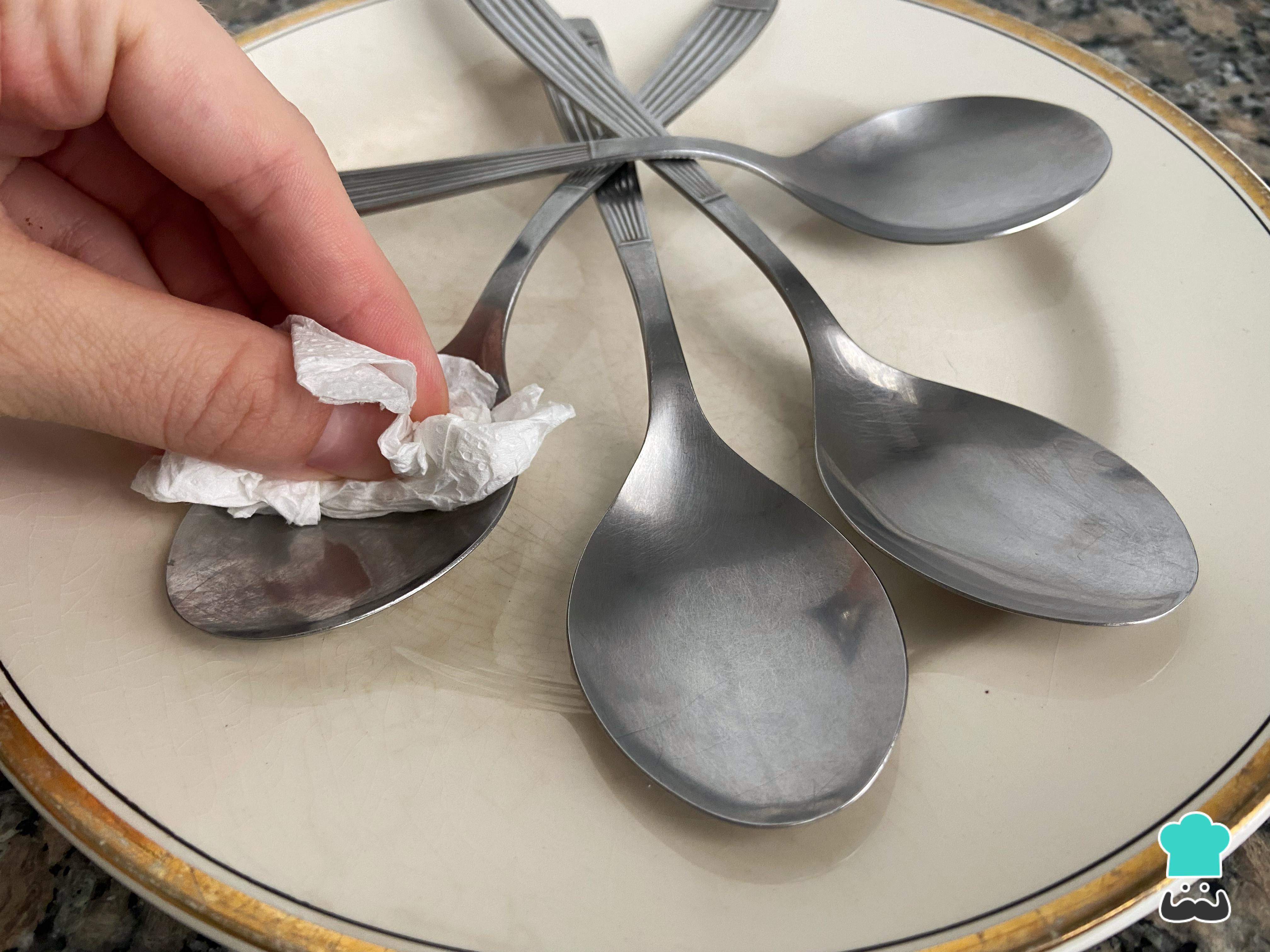 Truco: si las cucharas se mueven, puedes previamente forrar el borde del plato con papel aluminio para apoyarlas sobre él, así no se moverán.
