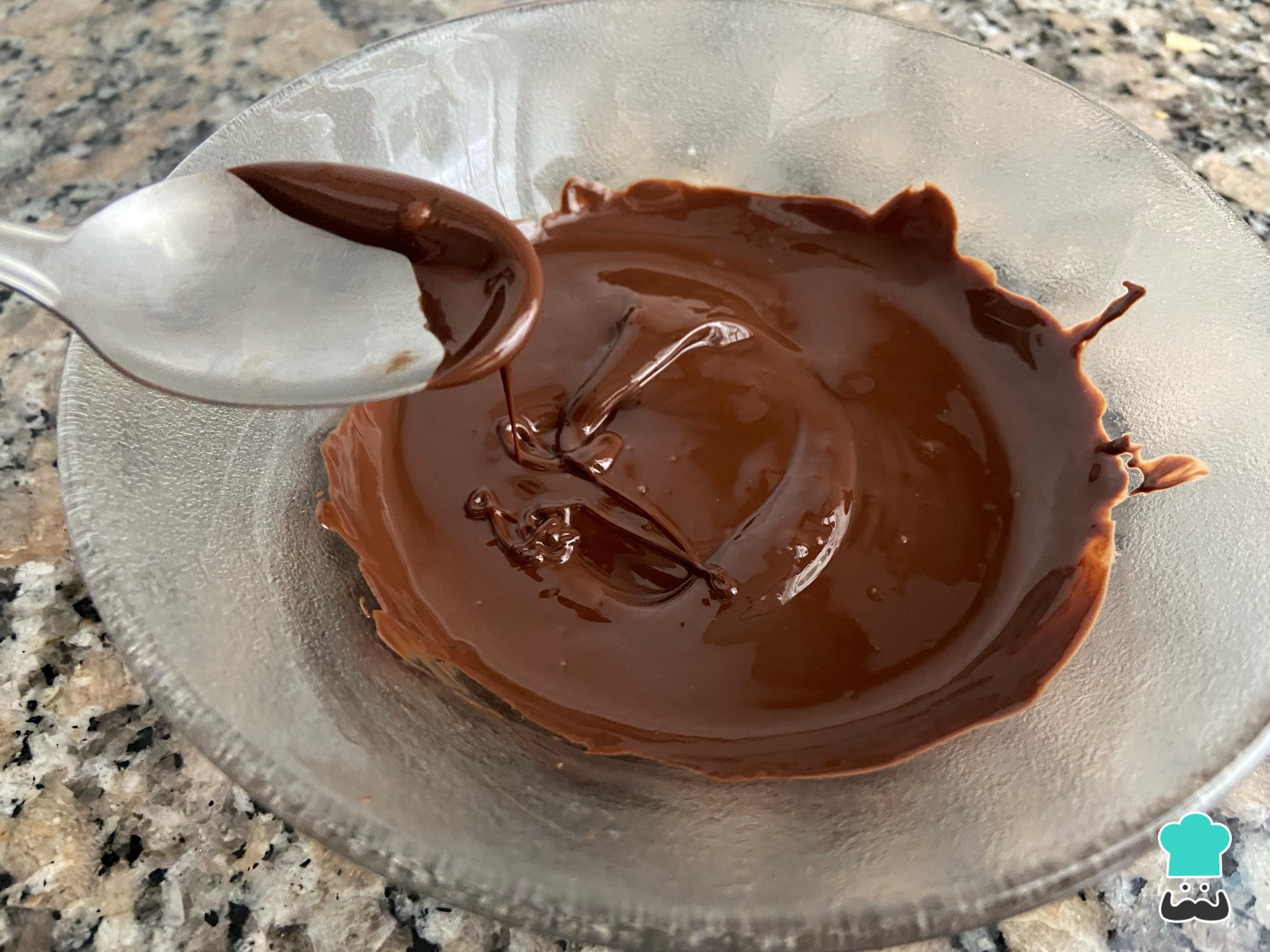 Derrite el chocolate en el microondas o al baño María. Para la primera opción, dispón el chocolate en un recipiente apto para el electrodoméstico y configúralo con la potencia más baja. Caliéntalo 1 minuto y remueve. Repite hasta que esté completamente derretido. Para la segunda opción, dispón el chocolate en un recipiente sobre otro con agua hirviendo, sin que entren en contacto. Mezcla hasta que esté derretido.
