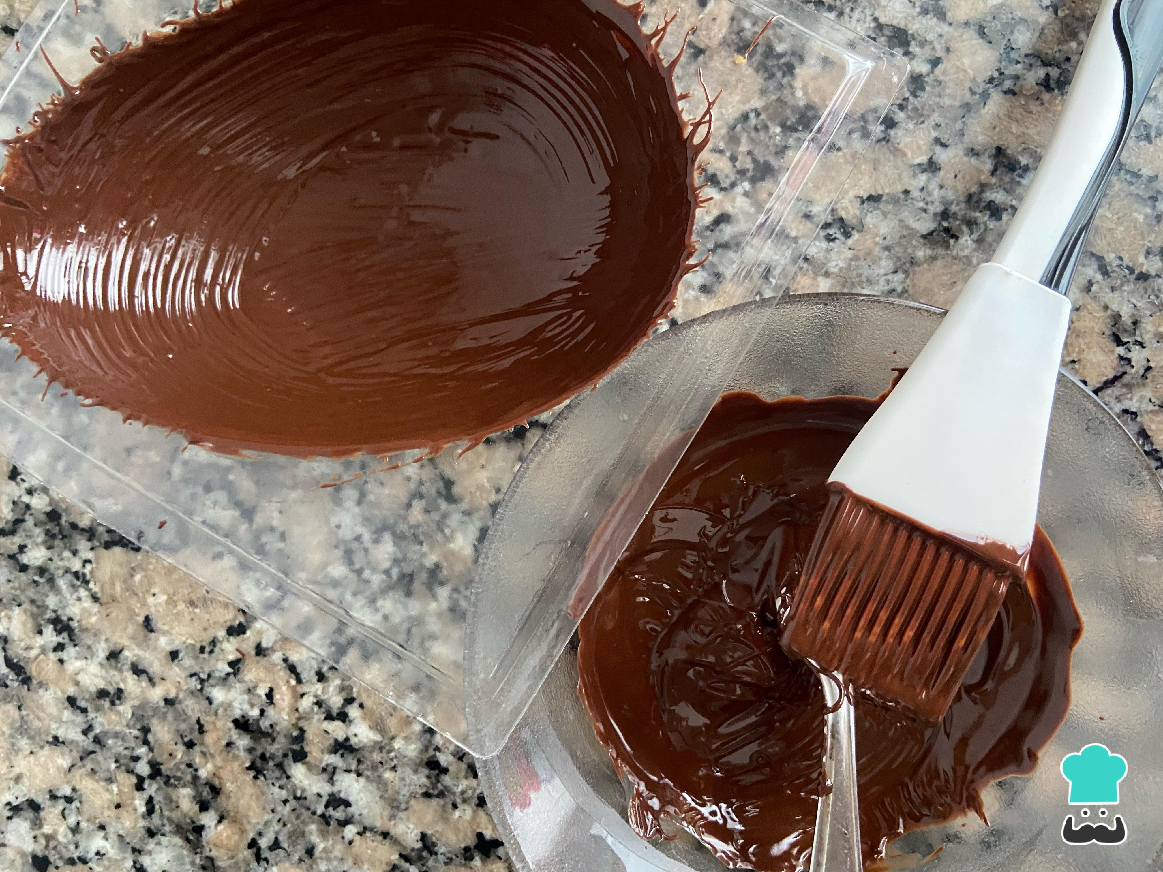 Pinta, con ayuda de un pincel de cocina, la superficie del molde de huevo con el chocolate derretido. A continuación, crea una capa fina y llévalo a la nevera por un mínimo de 10 minutos. Repite este proceso tantas veces como sea necesario para que no queden huecos.
