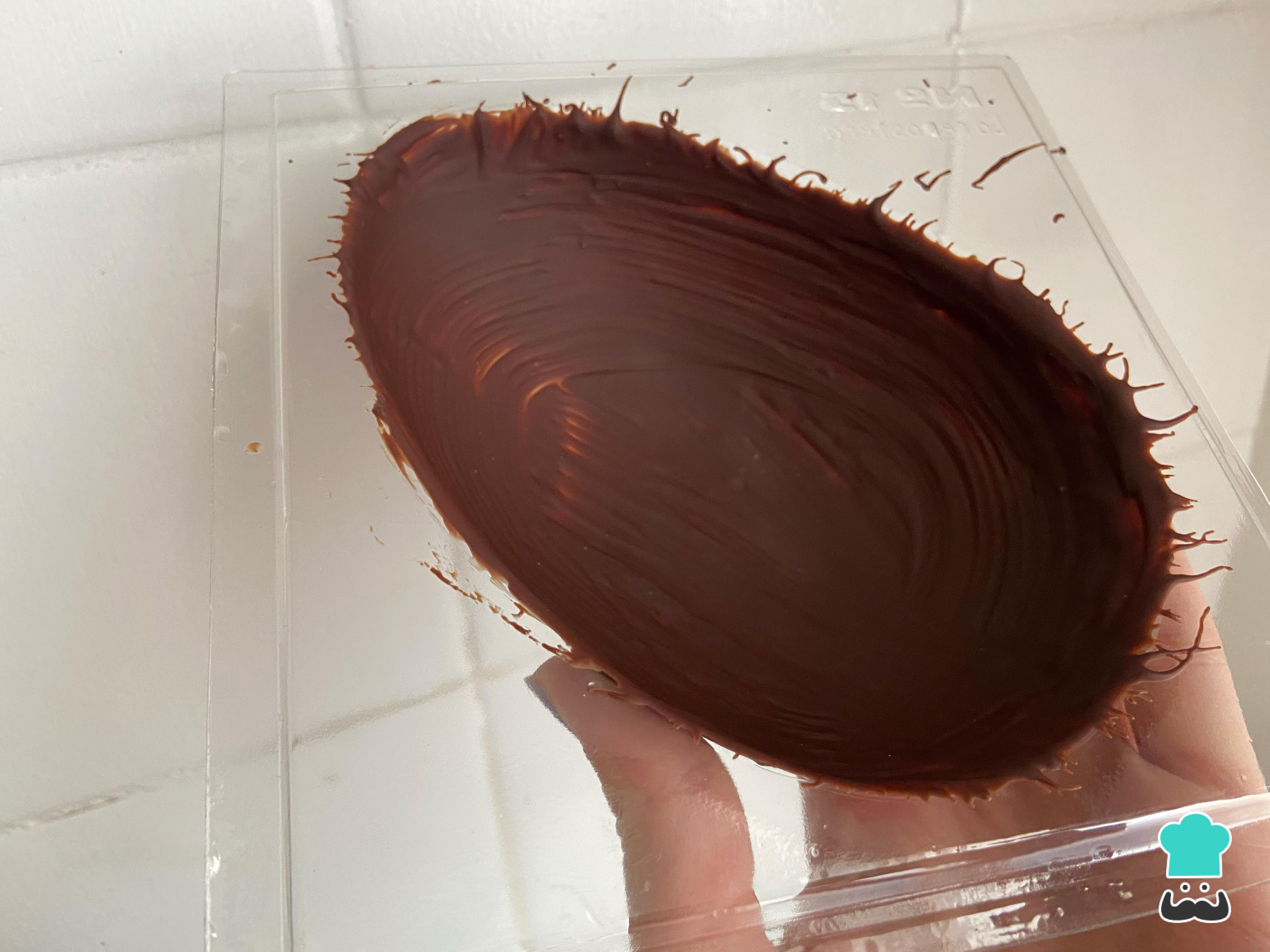 Entre capa y capa puedes colocar tu huevo a contraluz para corroborar que no quedan espacios sin chocolate. Puedes observar en la imagen cómo debería quedar.