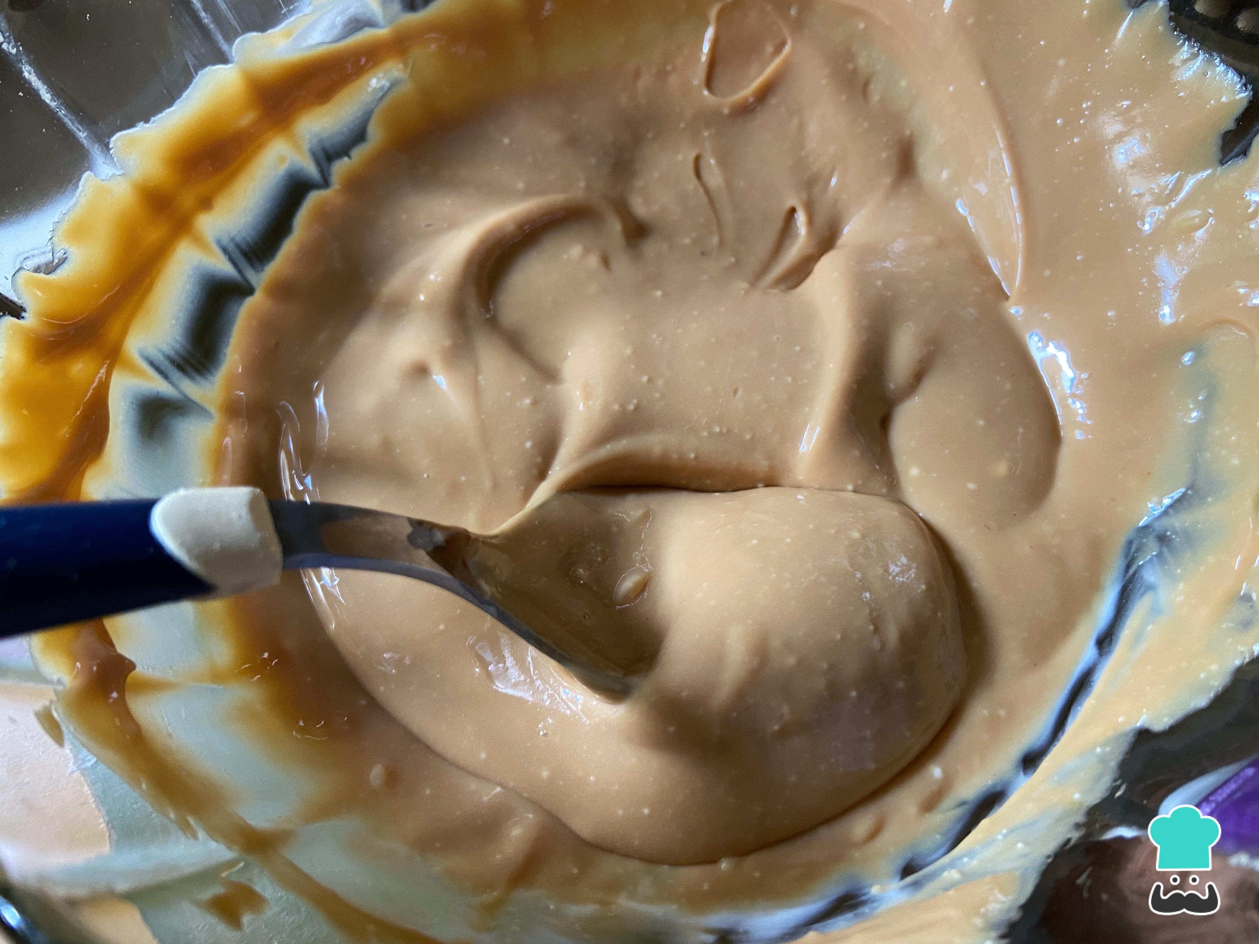 Mientras se enfría la última capa de chocolate, mezcla el queso crema con el dulce de leche. Pruébalo y agrega más dulce o crema si lo consideras necesario.