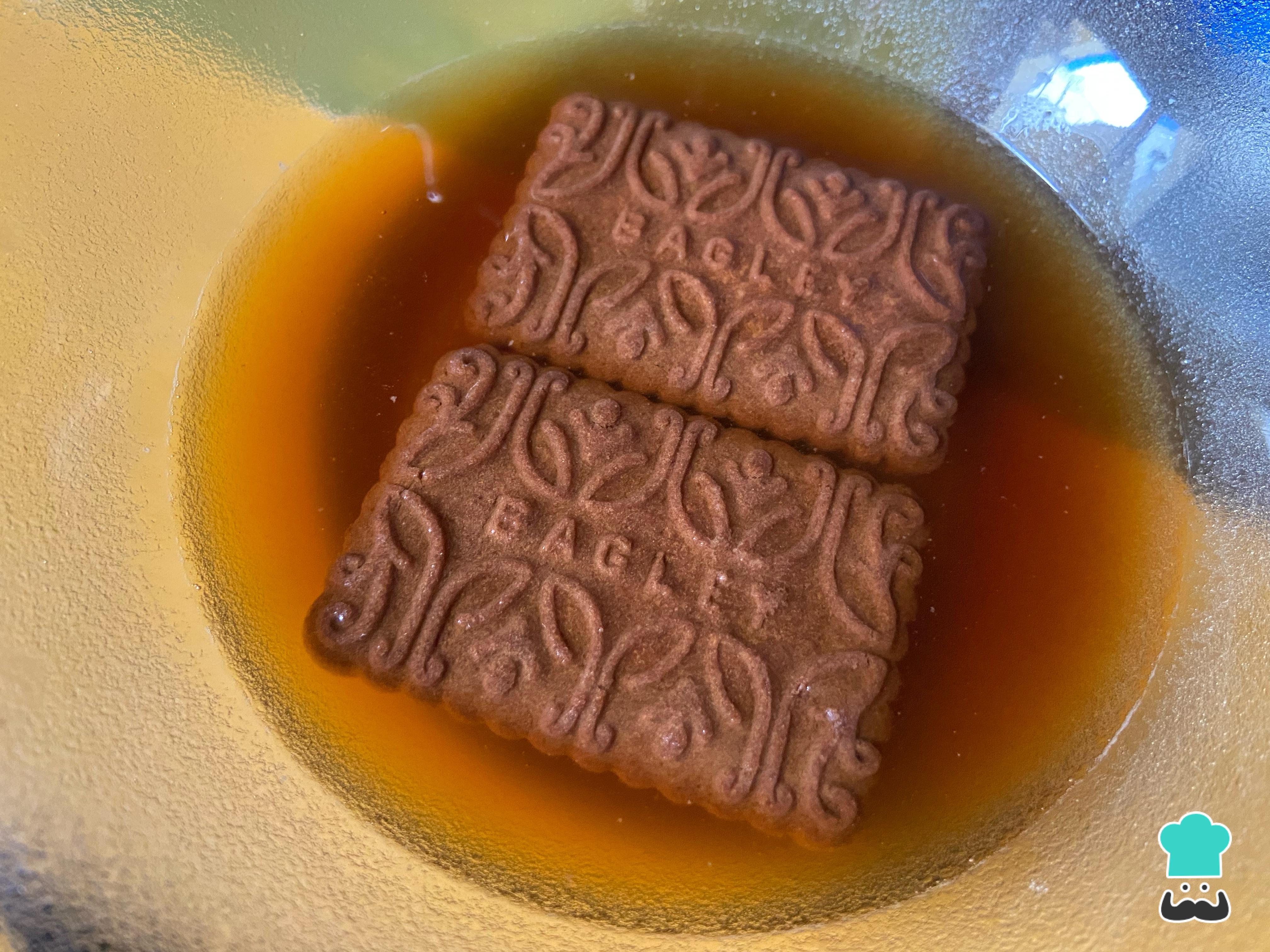 A continuación, remoja las galletitas de chocolate en el café suave. Y, si lo deseas, puedes reemplazar el café por chocolatada, es decir, cacao disuelto en leche tibia.