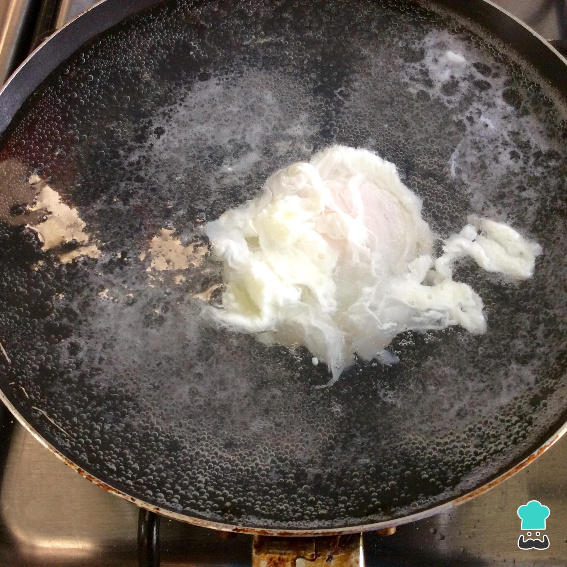 Agrega el huevo con mucho cuidado a la sartén con agua y, con una espátula, trata de colocar la clara sobre la yema formando una bola con el huevo, fíjate en la fotografía. Cocina así hasta que la clara se vea bien blanca y consistente.