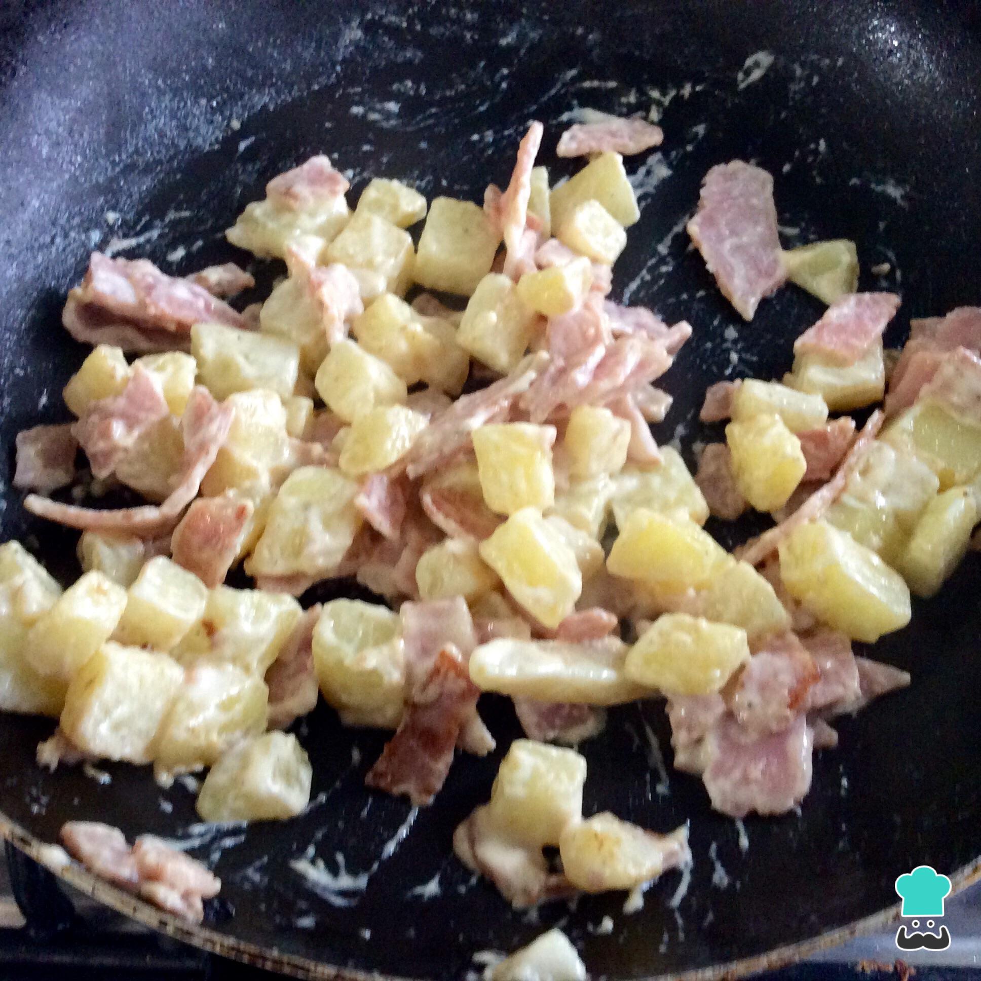 Luego, agrega las patatas, la crema de leche, sal y pimienta al gusto. Cocina los ingredientes hasta que estén listos.