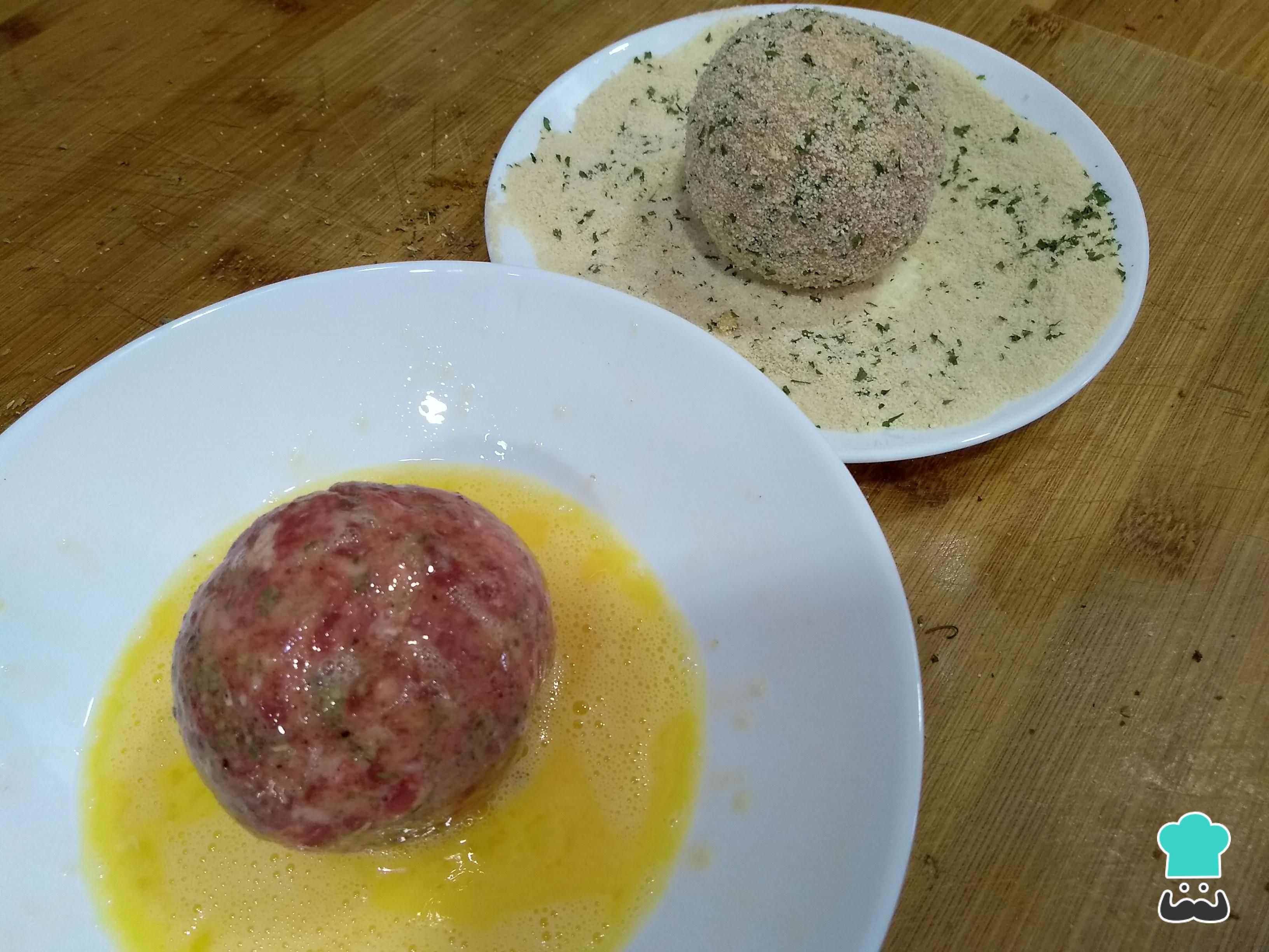 Una vez queden bien redondeadas ambas bolas, prepara pan rallado en un plato. Si te apetece, añade un poco de perejil picado y ajo en polvo. Bate el huevo con un poquito de sal y disponte para rebozar los huevos escoceses.