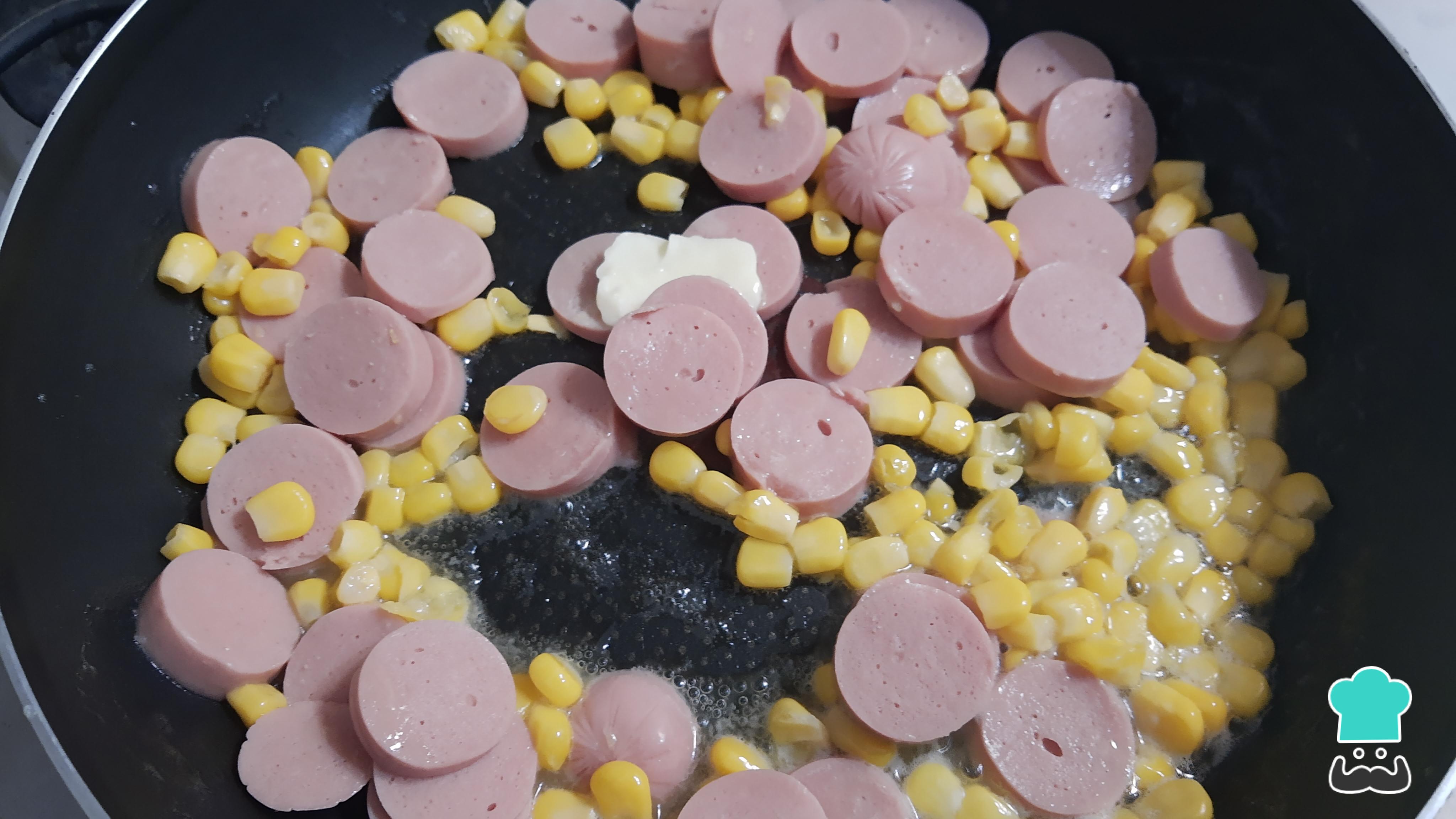 Calienta una sartén y agrega la mantequilla para derretirla. Enseguida, agrega la salchicha cortada en rodajas y el grano de elote amarillo, mantén a una temperatura media y deja dorar ligeramente.