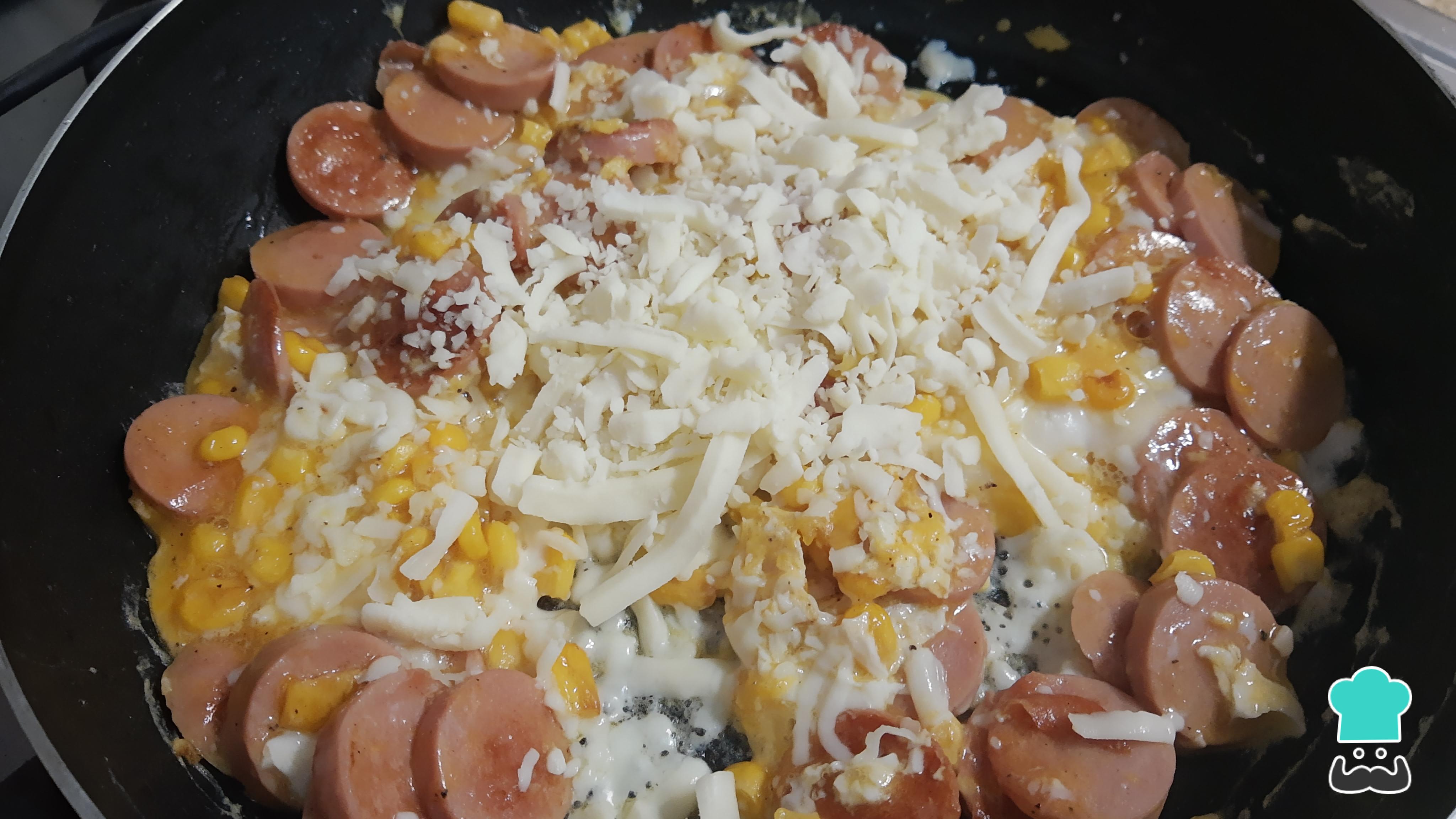 Cuando la salchicha y los granos de elote amarillo estén ligeramente dorados, es momento de añadir los huevos, un poco de sal y pimienta al gusto, mezcla para hacerlos revueltos.