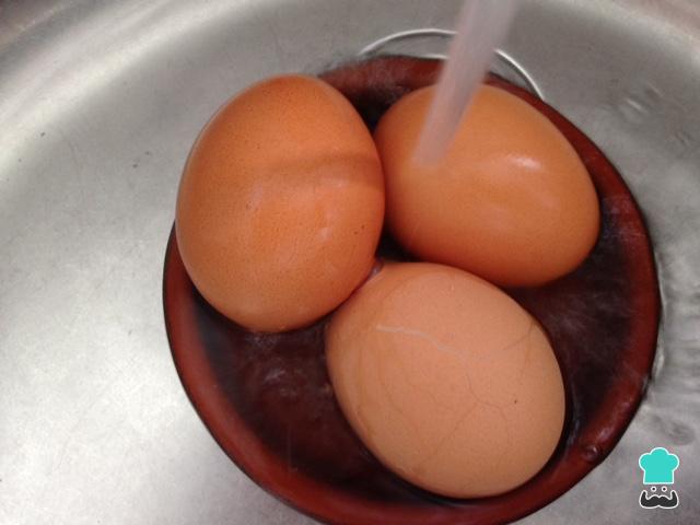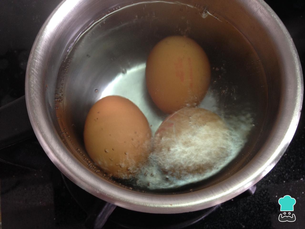 Empezamos con la cocción de los huevos. Vertemos agua en un cazo y, cuando hierva, añadimos los huevos con la ayuda de una cuchara, para evitar que la cáscara se rompa al chocar contra el fondo de la cazuela. De media podemos calcular diez minutos de cocción, para que el huevo quede duro, aunque si son muy grandes habrá que dejarlos un minutos más.
