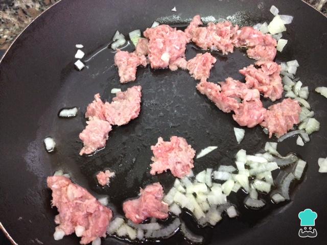 Mientras los huevos se cuecen, empezamos a preparar el relleno. En una sartén tiramos un chorro de aceite y el cuarto de cebolla, previamente picada. Al tiempo que se cocina, siempre a fuego lento, iremos desmenuzando la carne con la ayuda de un tenedor de madera.