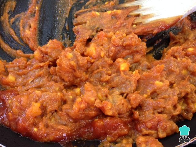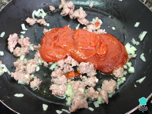 Cuando la cebolla y la carne estén doradas, verteremos la salsa de tomate y removeremos bien. Lo dejaremos cocer de seis a diez minutos.
