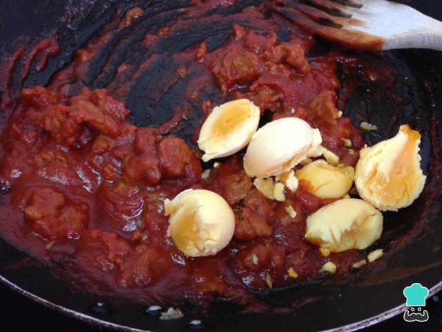 Pelamos los huevos y los cortamos por la mitad con cuidado. Con la ayuda de una cuchara vaciaremos la yema y la añadiremos a la salsa de tomate y carne, cuyo fuego está ahora al mínimo.