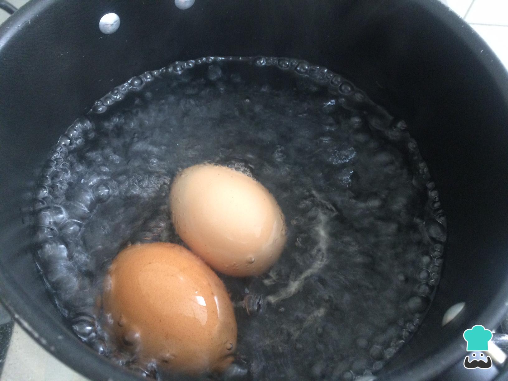 En una olla con agua hirviendo y un chorro de vinagre, agregar los huevos y cocinar 12 minutos. Cuando estén listos retirar la cáscara con mucho cuidado.