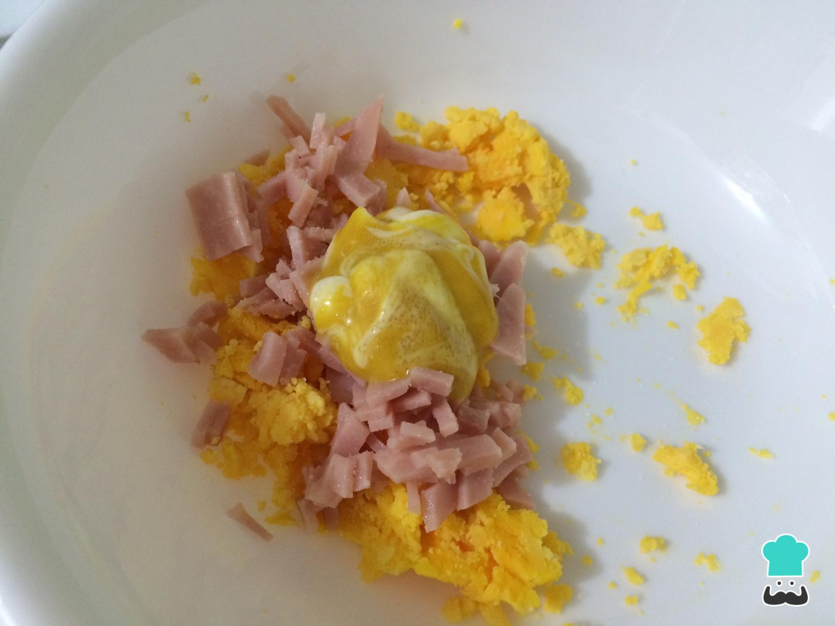 Es momento de mezclar la yema con el resto de ingredientes para hacer el relleno para los huevos. Entonces, revuelve la yema cocida con la mayonesa, la mostaza y el jamón cortado finamente, salpimentar.