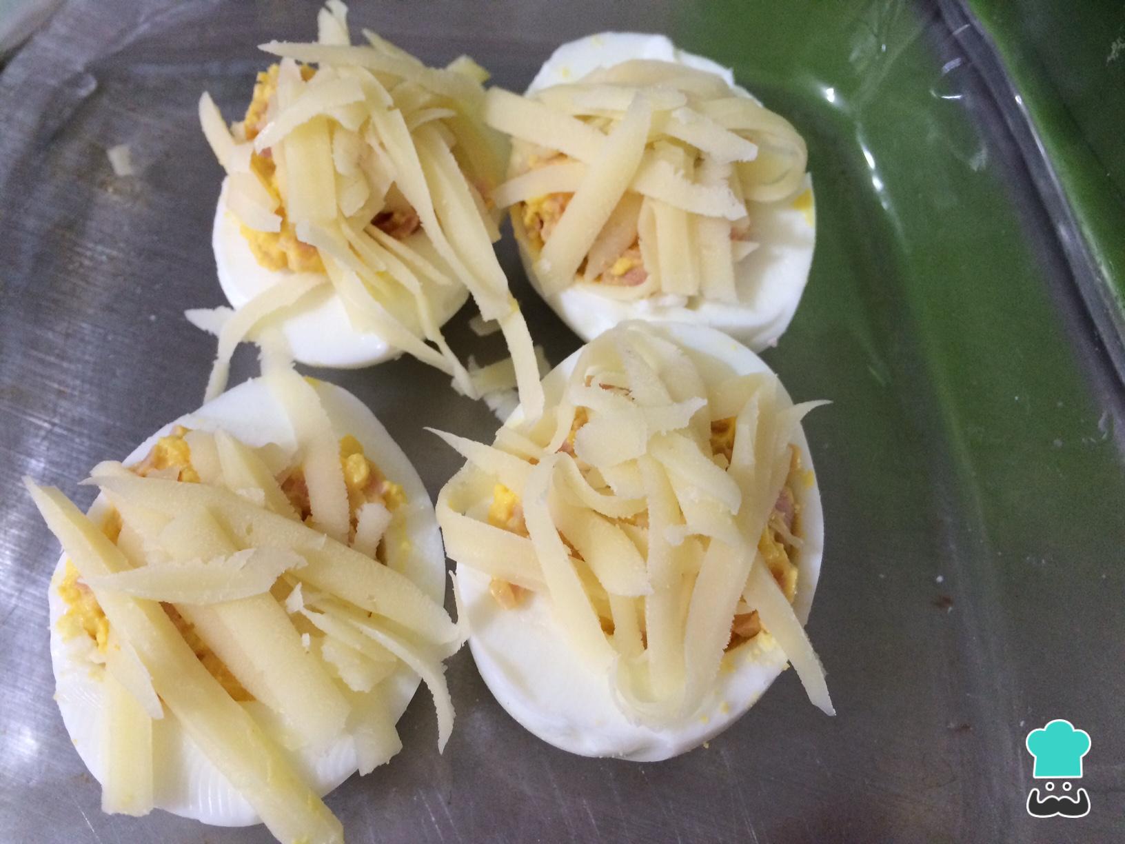 Rellenar los huevos con la mezcla anterior y sobre estos añadir el queso mozzarella rallado. Llevar al horno en una refractaria y hornear a 180°C durante 10 minutos hasta que el queso gratine.