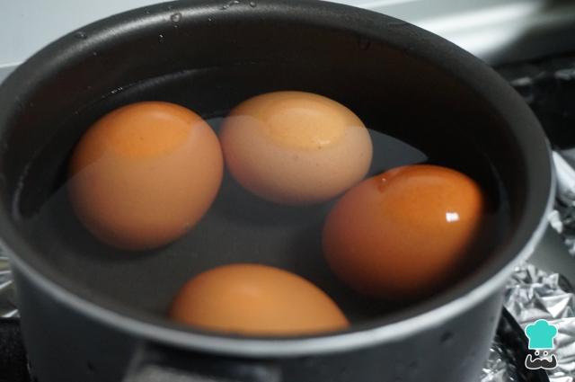 Pon un cazo con agua, añade los huevos y deja cocer durante 10-12 minutos cuando empiecen a hervir. Una vez cocidos, pásalos a un bol con agua fría para que se enfríen antes y así poder pelarlos. Pélalos, córtalos a lo largo, separa las yemas de las claras y reserva.