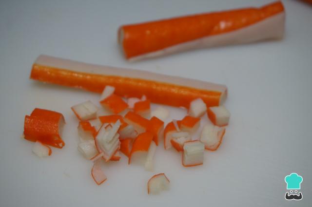 Pica el surimi con un cuchillo en trozos muy pequeños.