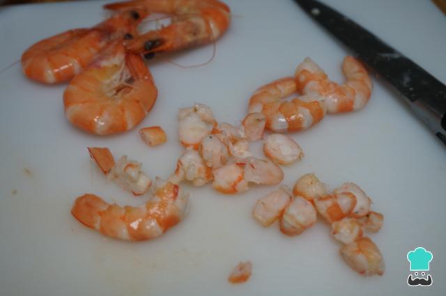 Pela los langostinos cocidos y córtalos en trozos pequeños dejando algunos para adornar los huevos. Puedes hacer los huevos rellenos de marisco con más ingredientes, como mejillones picados.