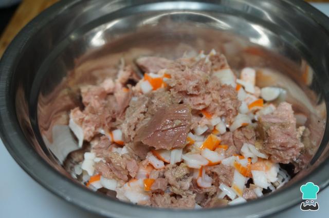 Introduce en un bol los palitos de surimi picados y las gambas también picadas. Escurre el aceite de las latas de atún, añádelo al bol con los demás ingredientes y mezcla. Añade la mitad de las yemas a la mezcla y remueve todo bien.