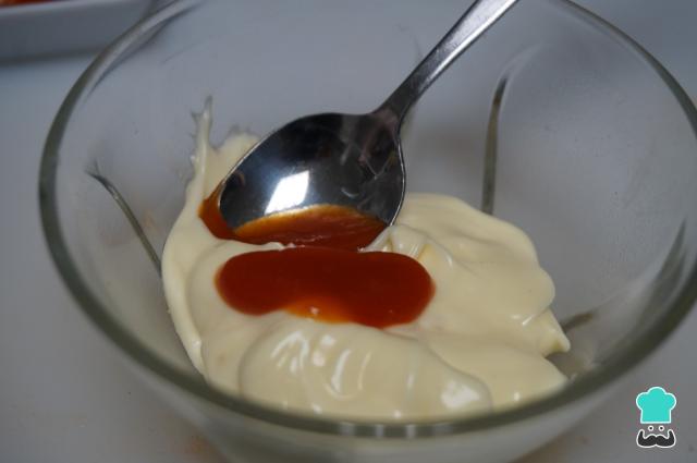 En otro bol, prepara una salsa rosa. Para ello, introduce la mayonesa con unas cucharadas de kétchup o tomate frito y mezcla. Ve añadiendo cucharadas de tomate hasta conseguir que quede a tu gusto. Prueba para agregar sal si es necesario. También puedes añadir unas cucharadas de brandy o zumo de naranja a la salsa para darle un toque extra de sabor.
