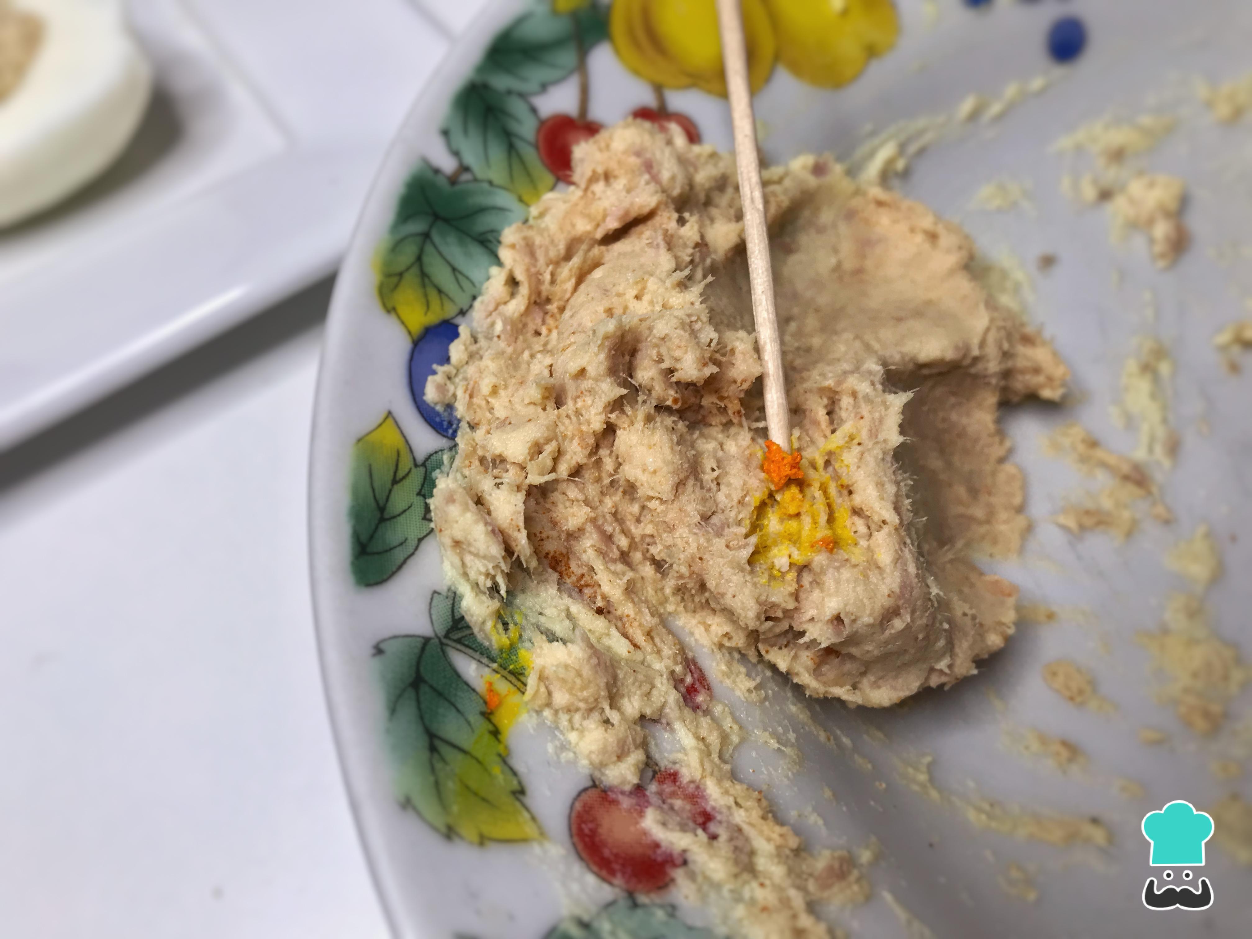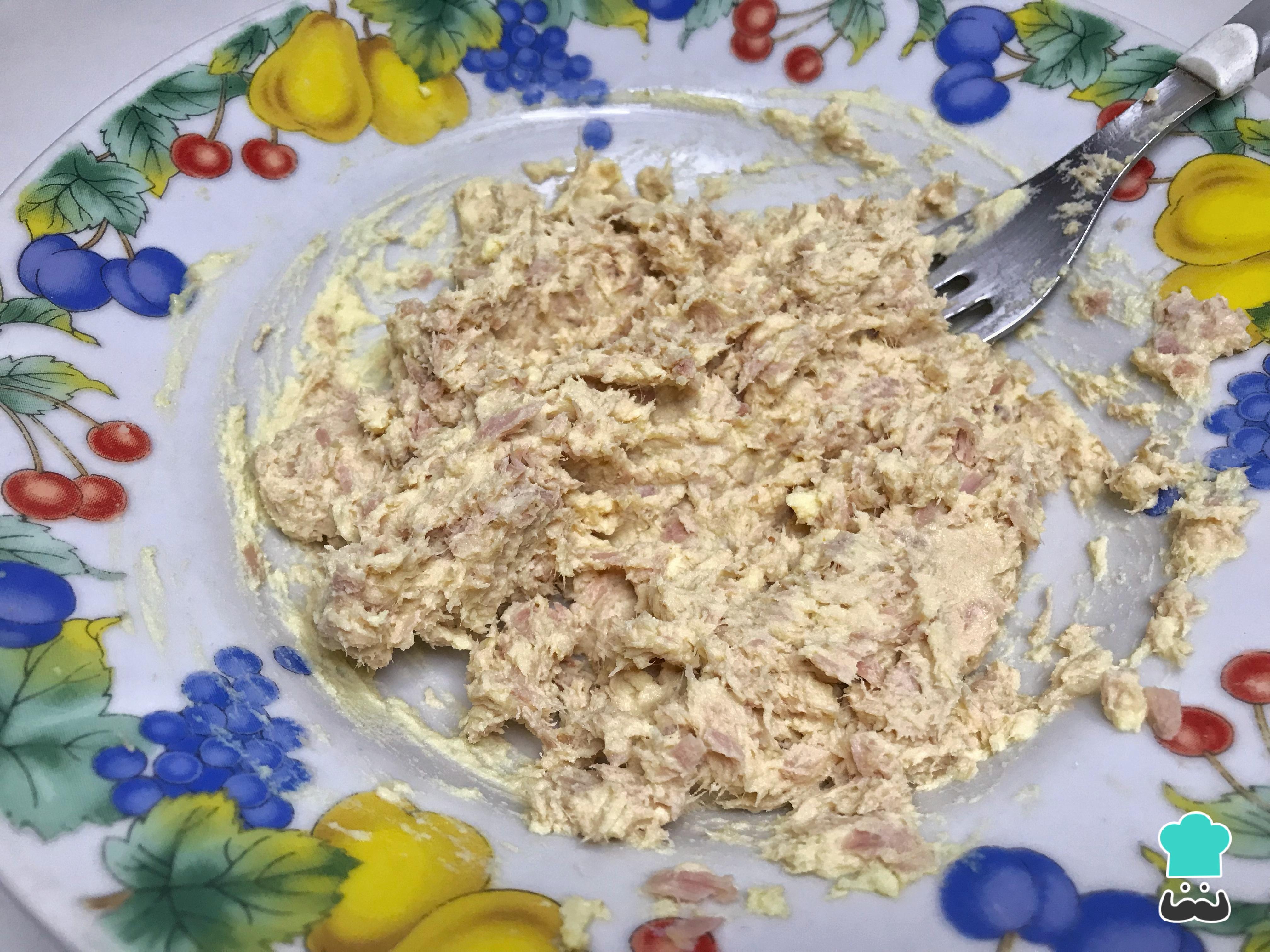 Mezcla la yema de los huevos con el atún y la mayonesa casera o de bote. Pruébalo y corrige el sabor hasta que te guste. Por ejemplo, puedes agregar más mayonesa, jugo de limón o mostaza.