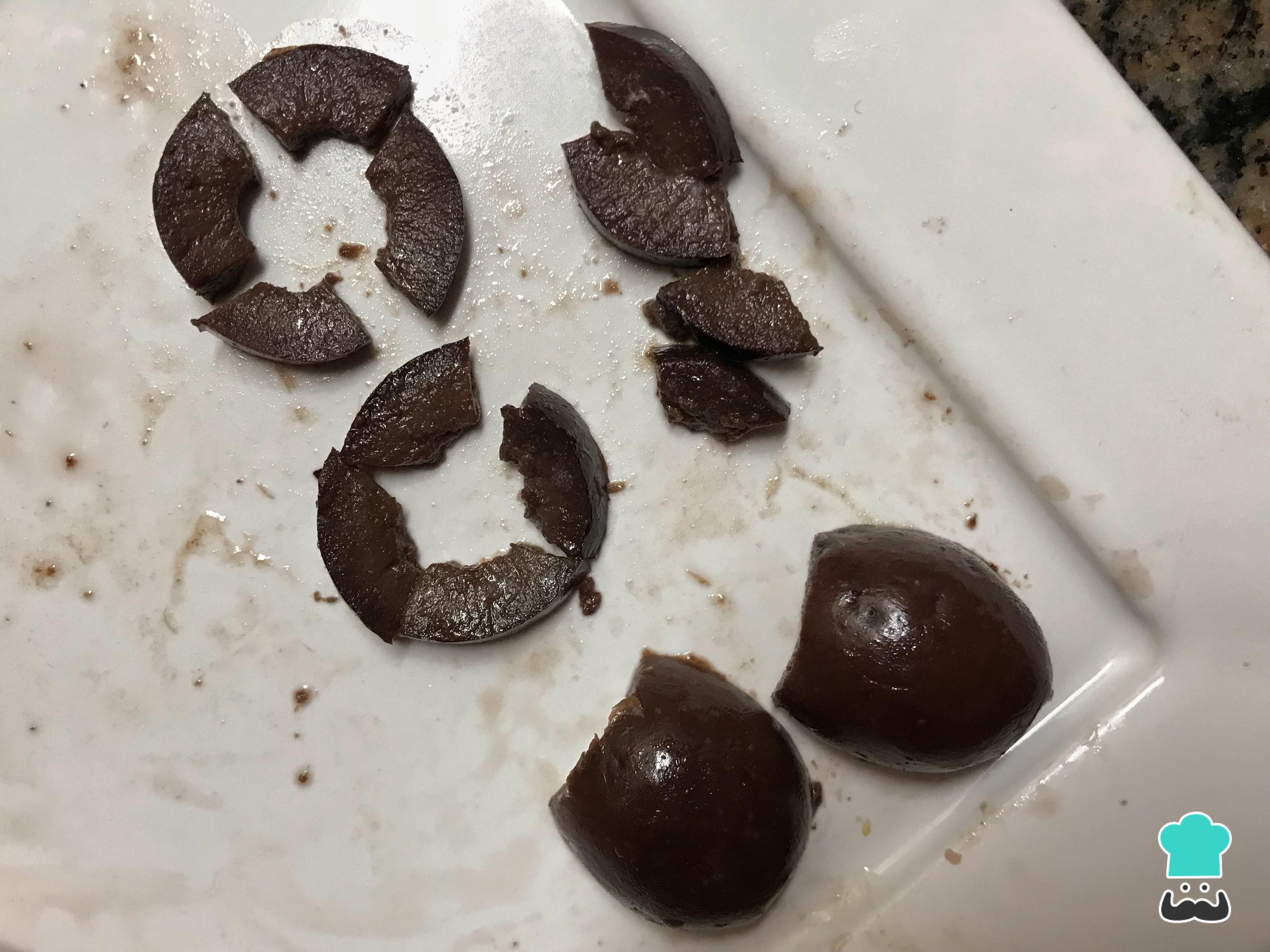 Luego, corta la otra aceituna en rodajas y, a su vez, en 4 trozos como bien puedes ver en la imagen. ¡Estas serán las patas de tus arañas!