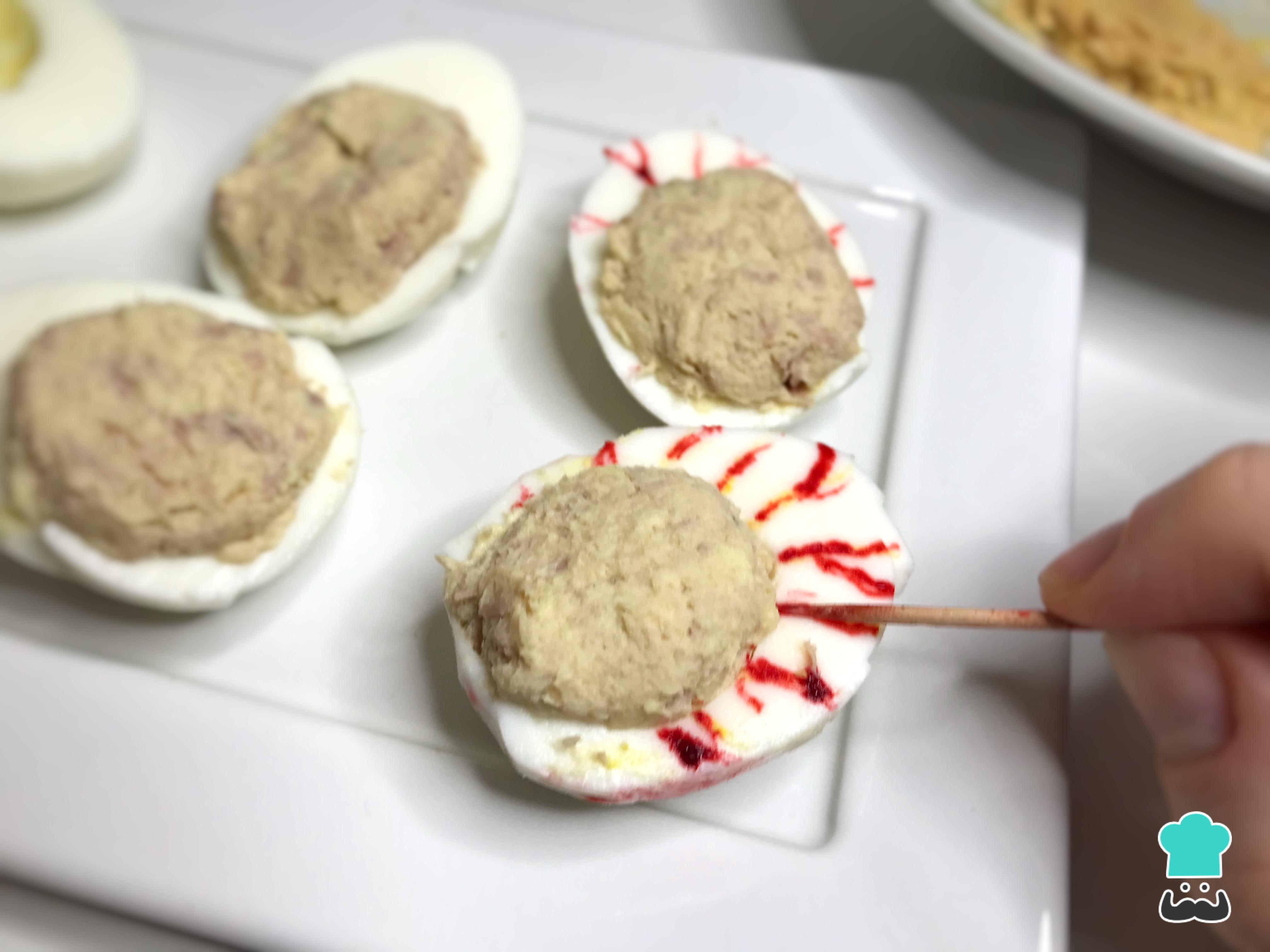 Por último, rellena las 2 mitades de huevos restantes y, con ayuda de un palillo de cocina y colorante rojo, haz líneas en la clara del huevo del centro hacia afuera. Con ellas, crearás las nervaduras de este ojo tenebroso.