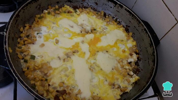 Se debe cortar el queso en fetas y esparcir sobre el choclo. Cuando se derrita el queso, se echan los huevos batidos y se esperar a se cocine la yema del huevo. Otra opción para que los huevos revueltos con maíz tierno queden rotos, es mezclar con una cuchara de madera o espátula mientras se cocinan.