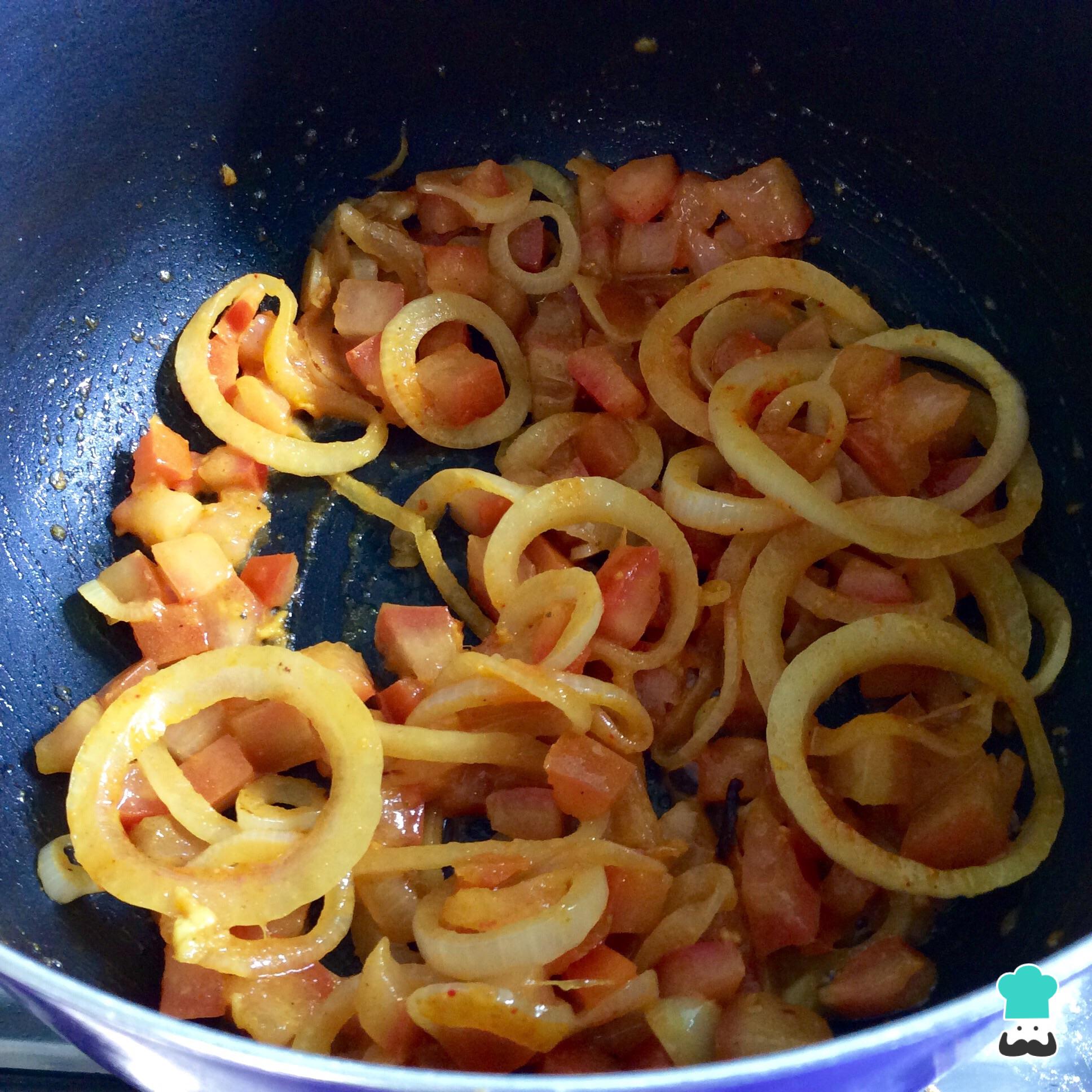 Pasados los tres minutos, agrega el tomate cortado en cubos y sin semillas y una pizca de curry en polvo, asegúrate de mezclar todo muy bien para que los ingredientes se impregnen del curry. Sigue cocinando a fuego bajo otros 3 minutos más.