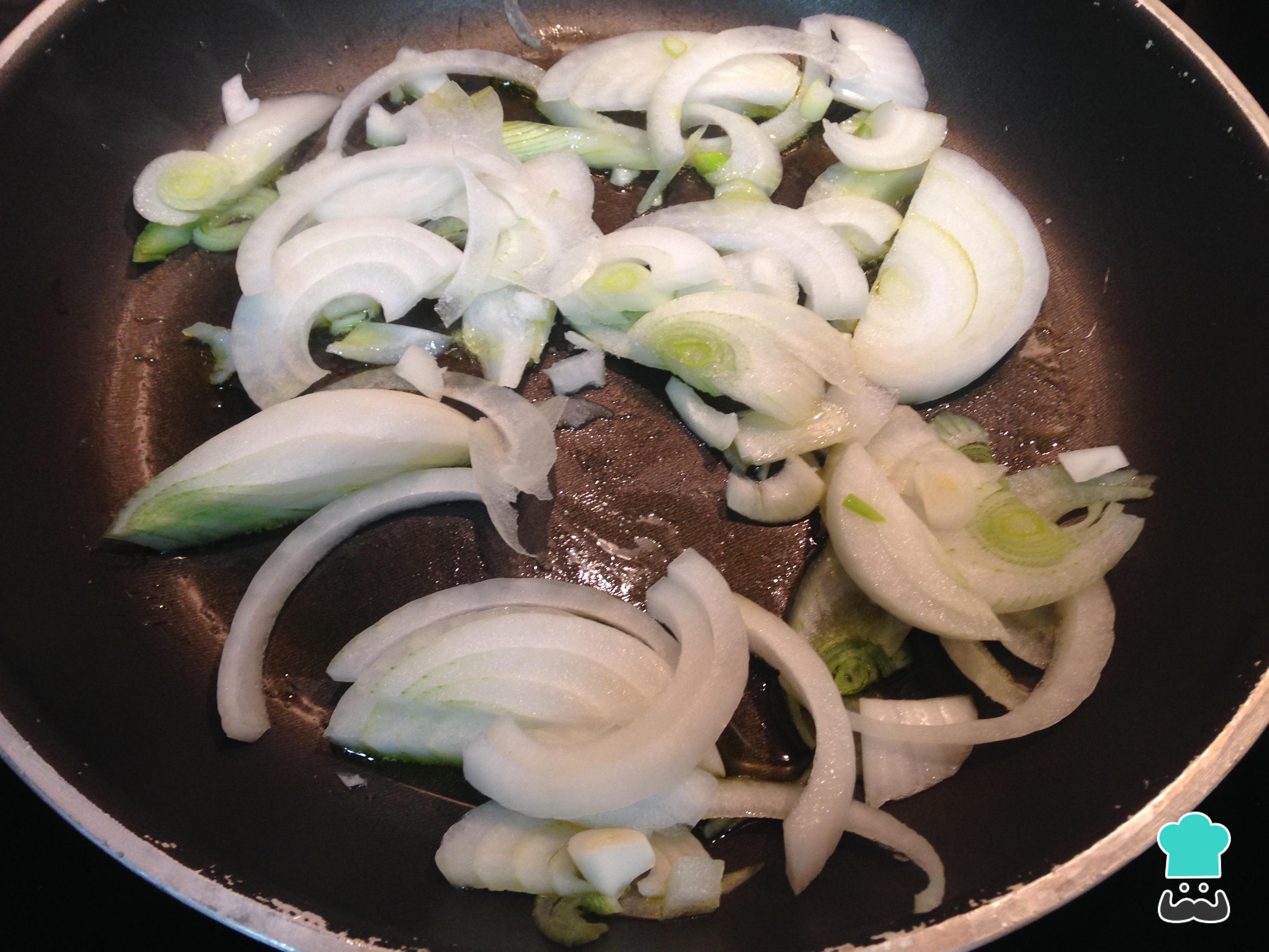 Hacemos un sofrito con la cebolleta. En una sartén echamos 2 cucharadas de aceite de oliva y agregamos la cebolleta cortada en juliana. Cocinamos durante 2 minutos.