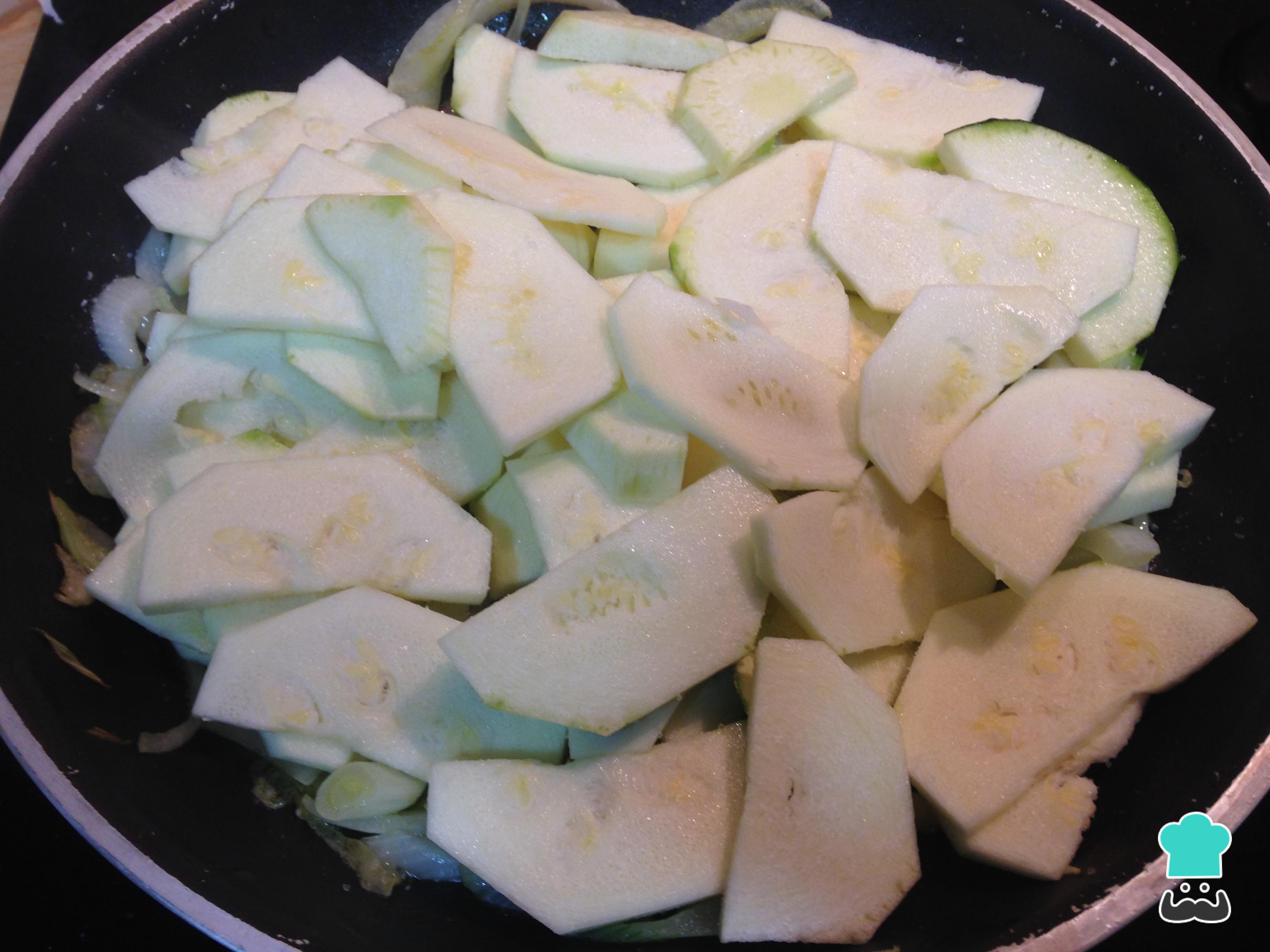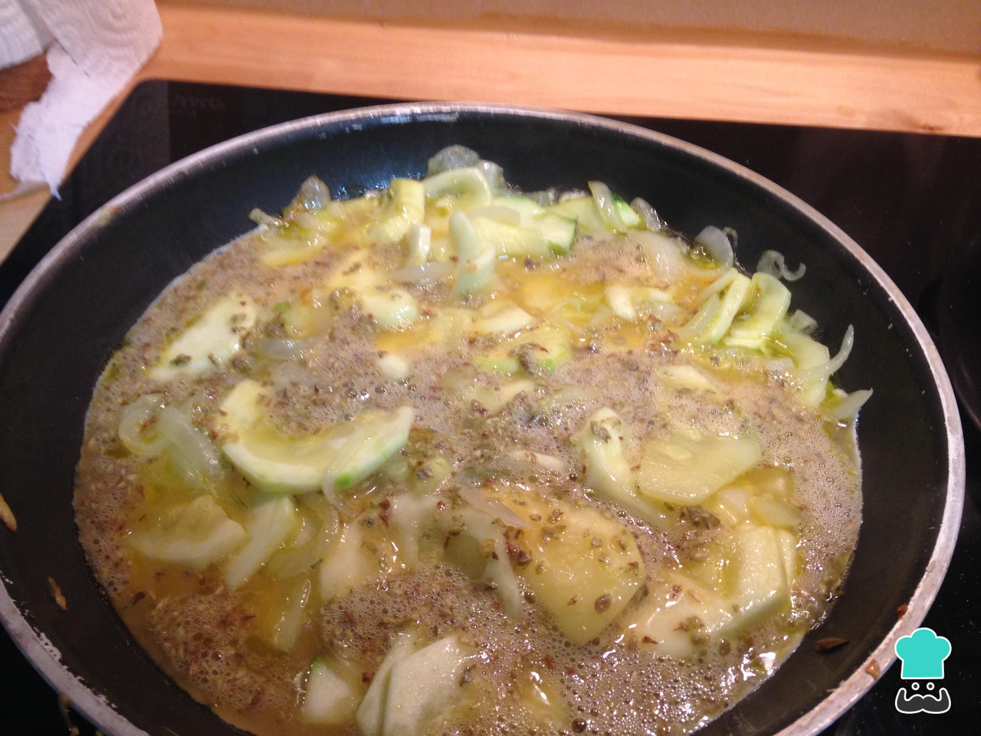 Agregamos el calabacín cortado en rodajas, añadimos sal y pimienta. Dejamos cocinar a fuego suave durante 10 minutos.