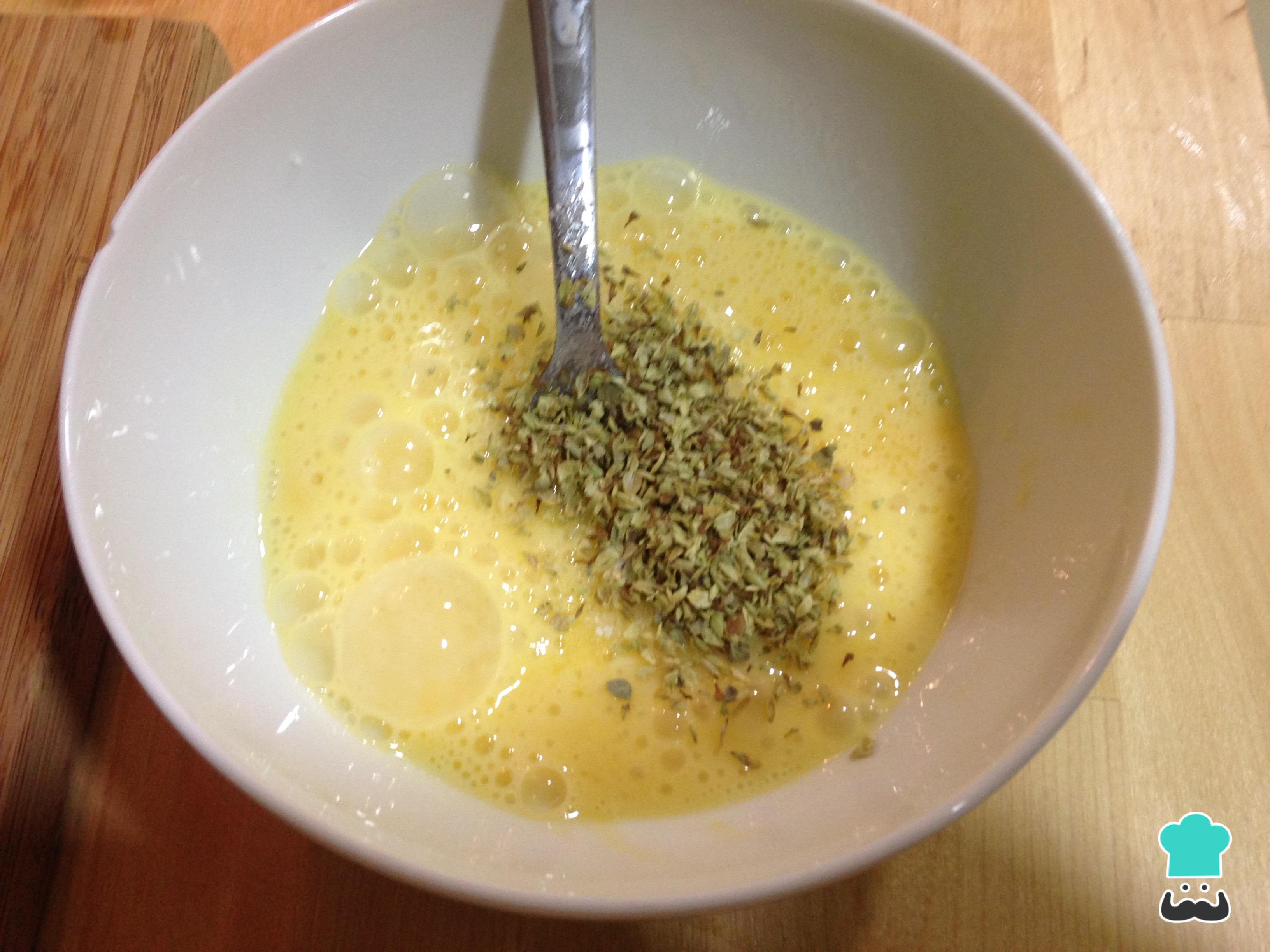 Batimos los huevos con una pizca de sal y añadimos el orégano.