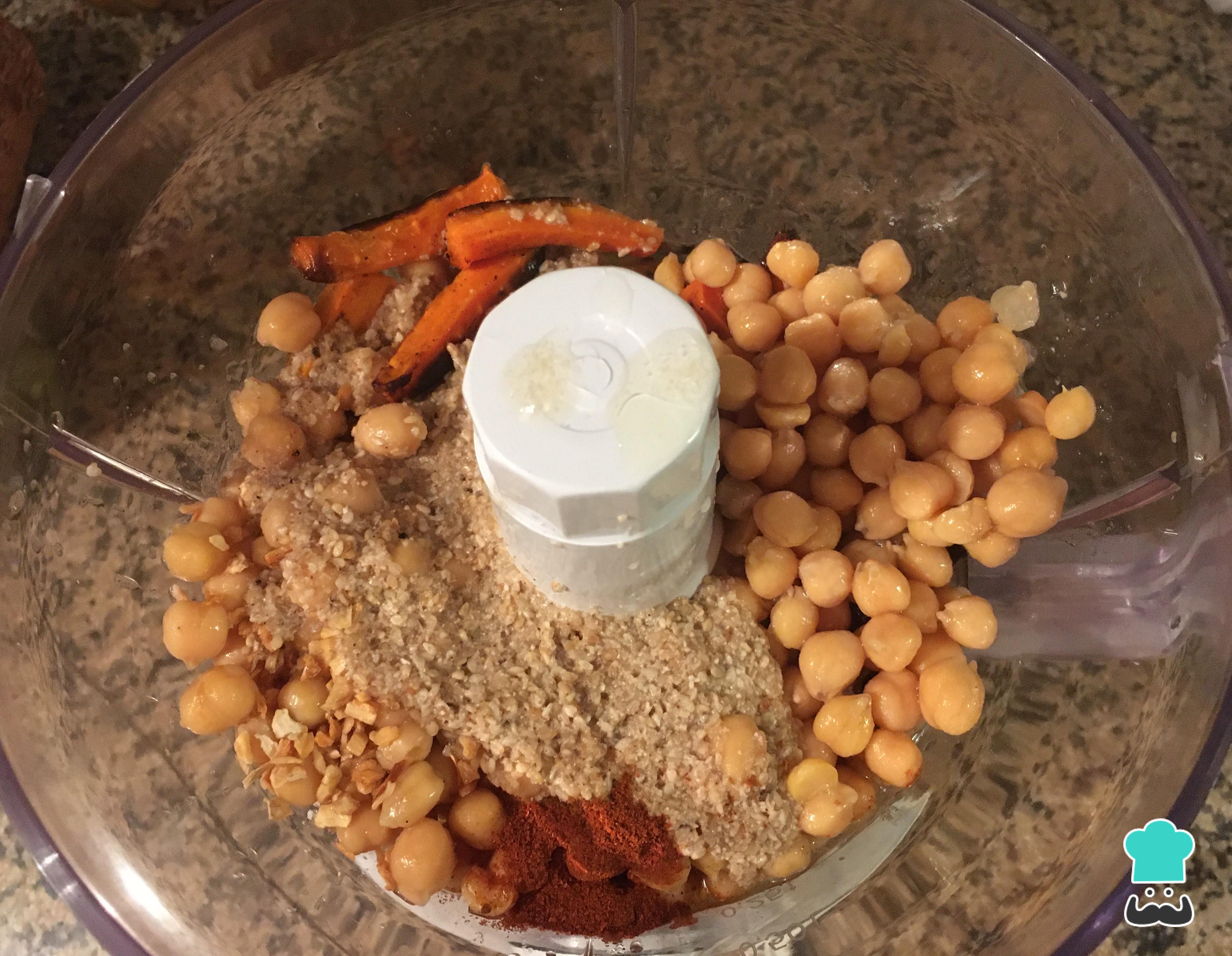 Truco: Si no consigues garbanzos en conserva, puedes remojar y cocinar garbanzos hasta que estén blandos para poder ser triturados. Utiliza la misma cantidad indicada en la receta.