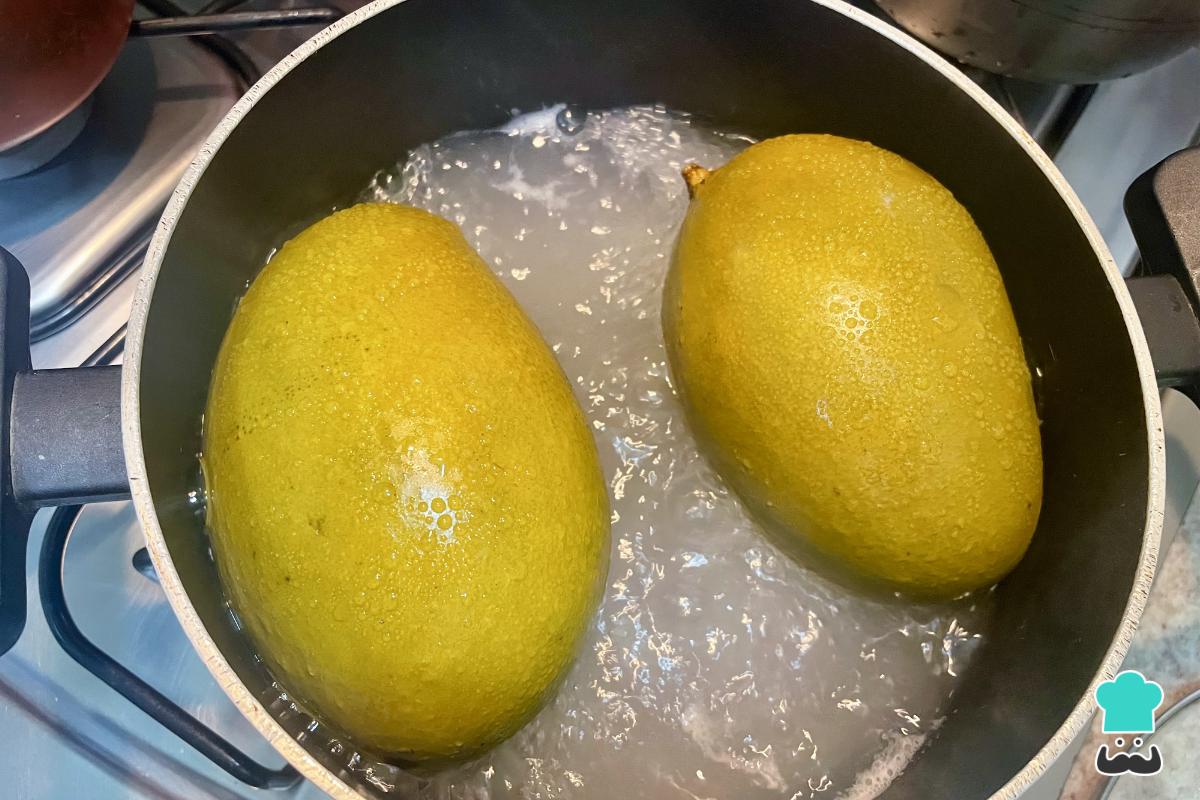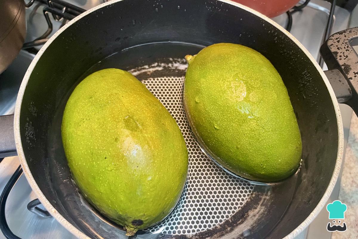 Lleva la olla al fuego y cocina hasta que el agua hierva. En ese momento notarás que los mangos cambian de color. Apaga el fuego y deja reposar hasta que se enfríen.