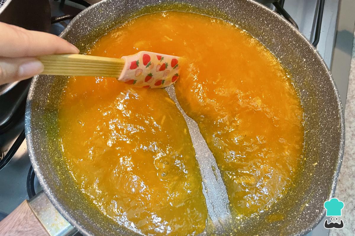 Después de unos 20 minutos de cocción, notarás que la jalea se despega fácilmente del fondo del sartén al pasar la espátula: ese es el punto perfecto para retirarla del fuego.
