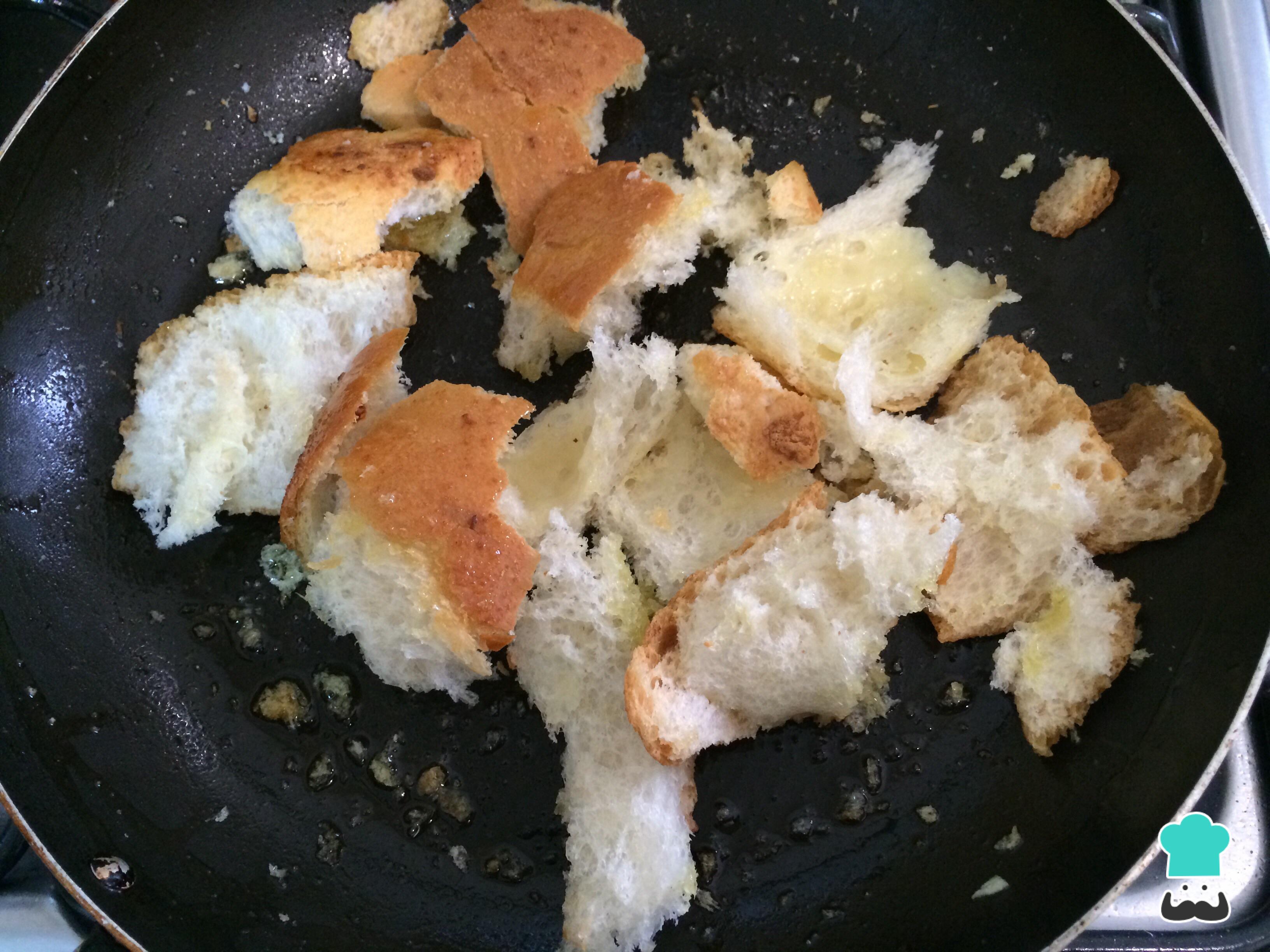 Retirar el ajo y, en la mismo sartén, agregar las rodajas de pan troceadas, saltear un poco hasta que estén doradas.