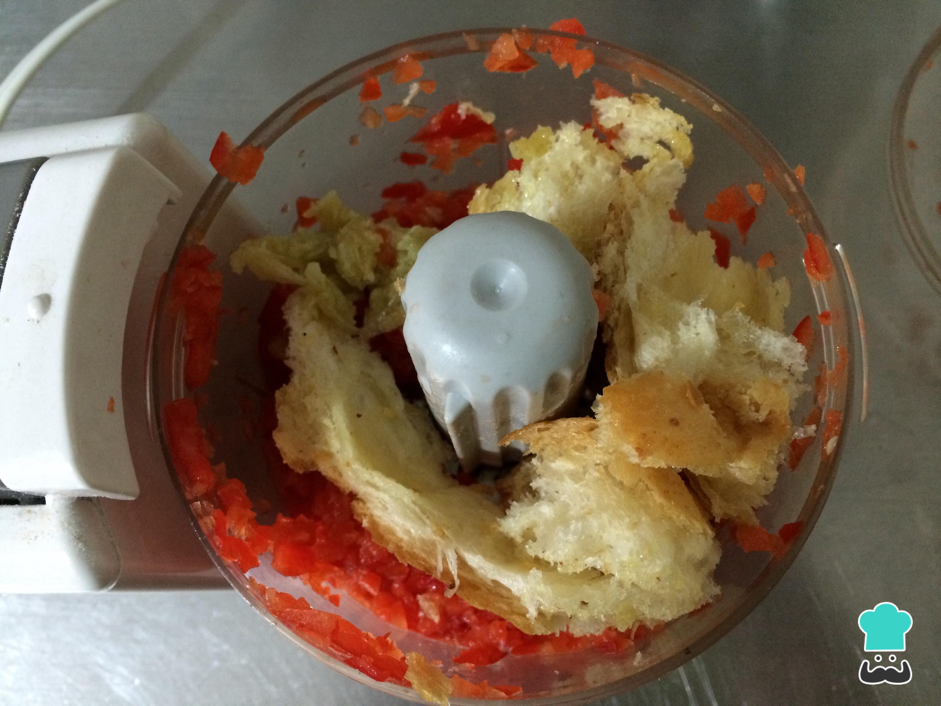 En un procesador triturar el pimiento rojo, cuando esté listo añadir el pan y el ajo. Procesar con aceite de oliva, sal, pimienta y un poco de agua hasta obtener una pasta.