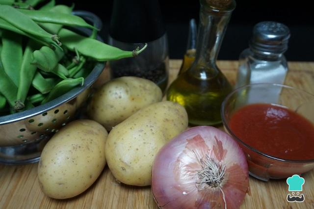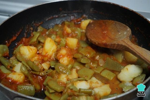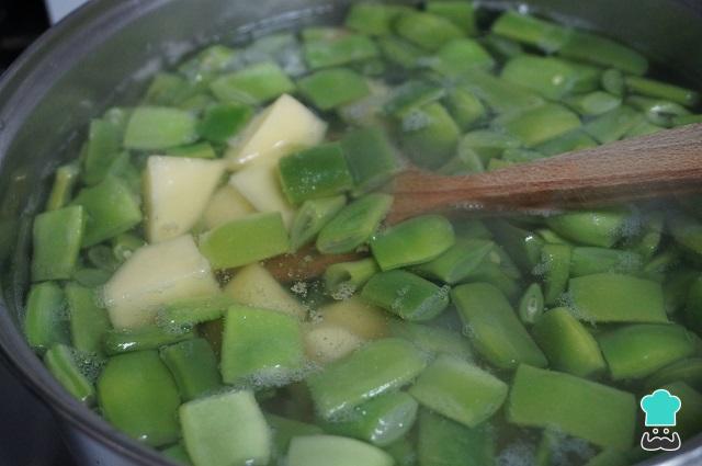 Ponemos una cazuela con abundante agua y un poco de sal, añadimos las judías y las patatas. Las dejamos cocer hasta que están cocidas unos 20 minutos.