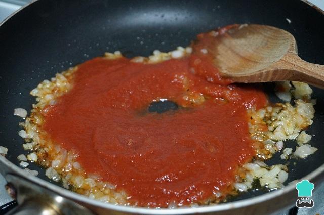 Mientras se cuecen las judías y las patatas, preparamos el tomate. Ponemos una cazuela a calentar con un poco de aceite, añadimos la cebolla cortada en trozos pequeños, dejamos pochar unos minutos y añadimos el tomate, ponemos un poco de sal y pimienta y dejamos que se cocine el tomate.