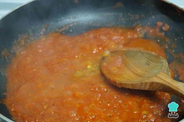 Cuando veamos que ya está el sofrito de tomate, como quedará muy espeso, añadiremos un poco de caldo de cocer las judías y dejamos la salsa de tomate a nuestro gusto.