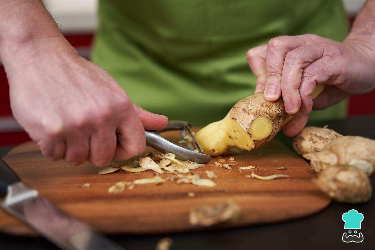 Pela un trozo pequeño de jengibre y rállalo finamente.