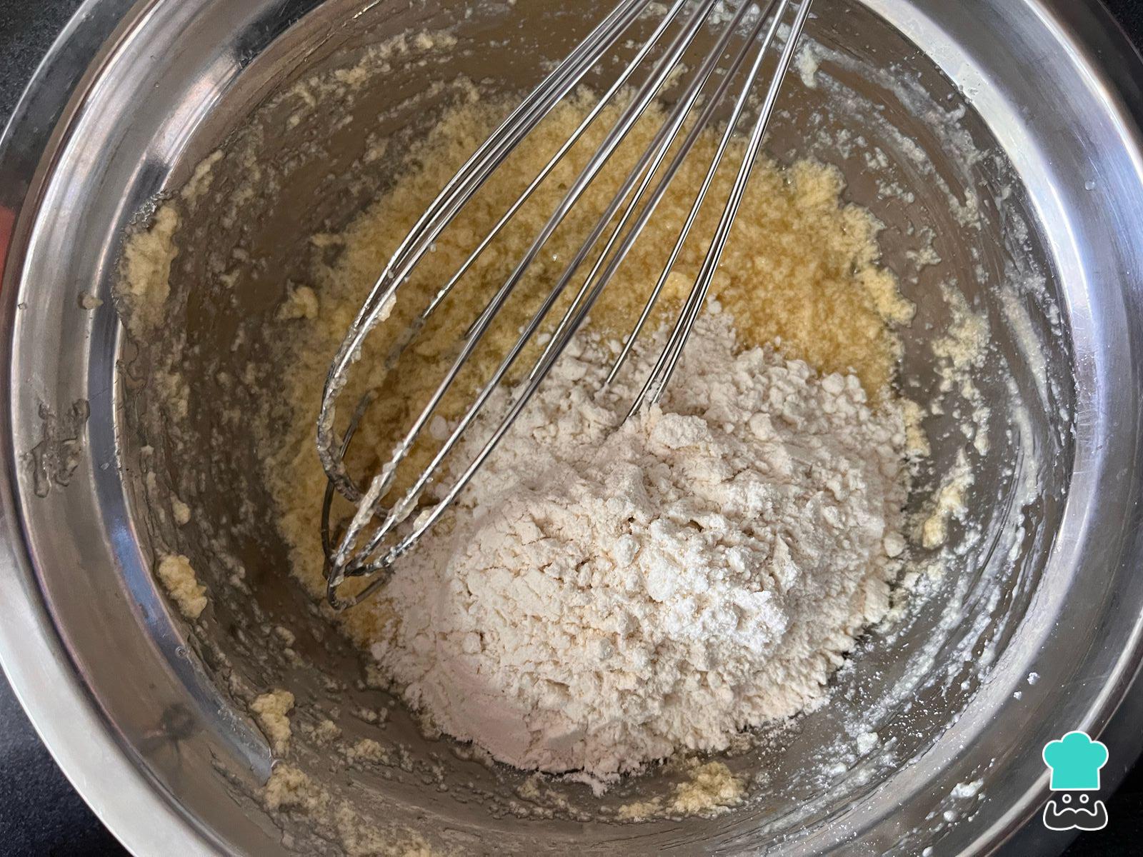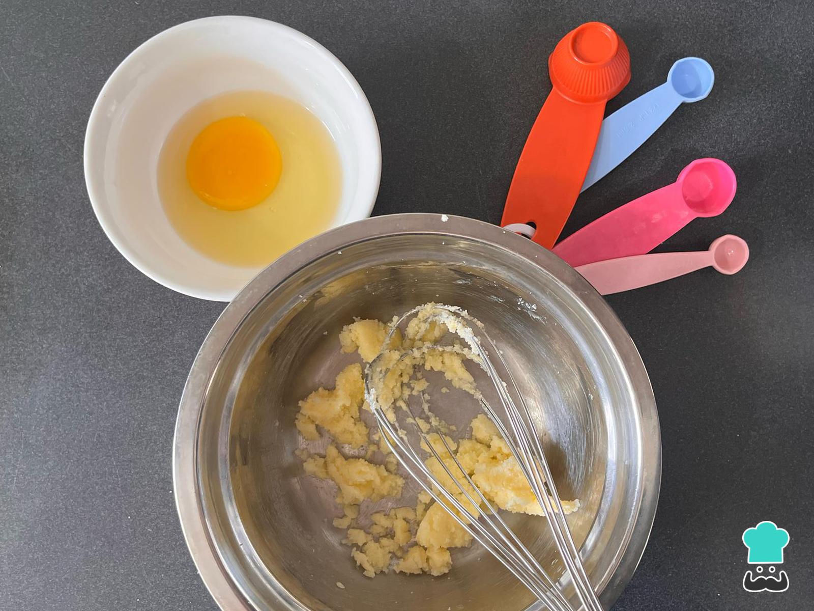 Añade en un bol la mantequilla a temperatura ambiente y el azúcar, mezcla. Luego, añade el huevo e integra bien.